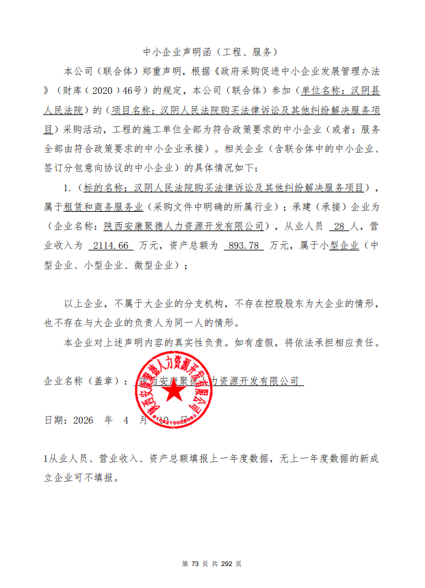 二、项目名称:汉阴人民法院购买法律诉讼及其他纠纷解决服务项目