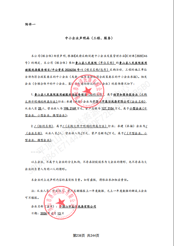 | *、采购项目名称:鲁山县人民医院医用被服洗涤服务项目 | |||||||||||||||||||||||||||||||