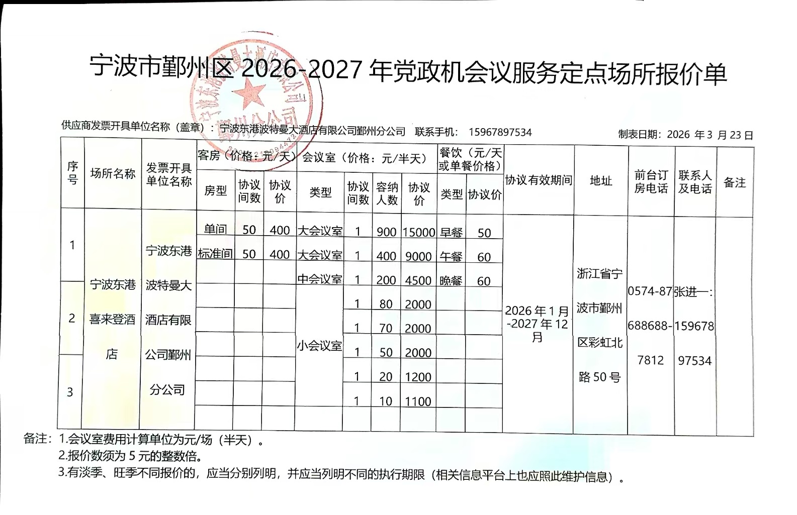 宁波东港波特曼大酒店有限公司鄞州分公司入围宁波市鄞州区2026-2027年党政机关会议定点场所框架协议采购项目的结果公告
