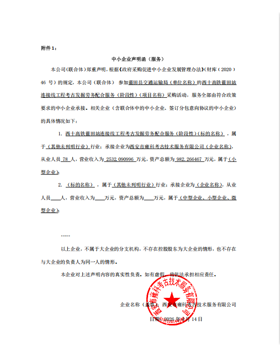 | * | 其他服务 | 完成西十高铁蓝田站连接线工程考古发掘劳务配合服务工作 | 西安市蓝田县 | *.供应商应对自身安全负责,要遵守国家的相关安全规定。供应商应严格执行《考古工地安全协议》的相关要求,遵守考古工地的安全规定,确保考古工地的项目安全、人员安全和文物安全。 *.应坚持“安全第一、预防为主”的原则,在开工前应根据实际情况制定安全保卫工作方案及应急预案。负责组织对所有参与工作的人员进行相关专业知识培训、安全警示教育,提高安全意识,防止和避免因工作失误和安全措施不到位诱发的安全责任事故。 *.供应商在考古发掘工作中对发现的古遗址、古墓葬等地下文物古迹负有看管保护的责任,并对相关信息负有保密的责任。 *.供应商考古驻地的所有工作人员、财物、设备、设施以及暂存文物标本的文物库房等的安全保卫工作由供应商全权负责。驻地暂存文物和标本的临时文物库房,必须符合有关存放文物的安全要求。 *.如被确认中标,则供应商于投标文件中承诺配备的人员必须配备到位,若需更换人员应先征得招标人同意,且替换的人员不低于被替换的人员的资质等级及工作能力。 *.中标单位应独立完成工作任务,不得以任何形式将工作任务再委托其他个人和机构。 | 自合同签订之日起**日历天内完成,如遇其他不可抗拒因素或重大考古发现,经双方协商一致,可以延长服务期限。 | 符合招标文件及国家、省市及行业相关“合格”要求。 | *,***,***.** |