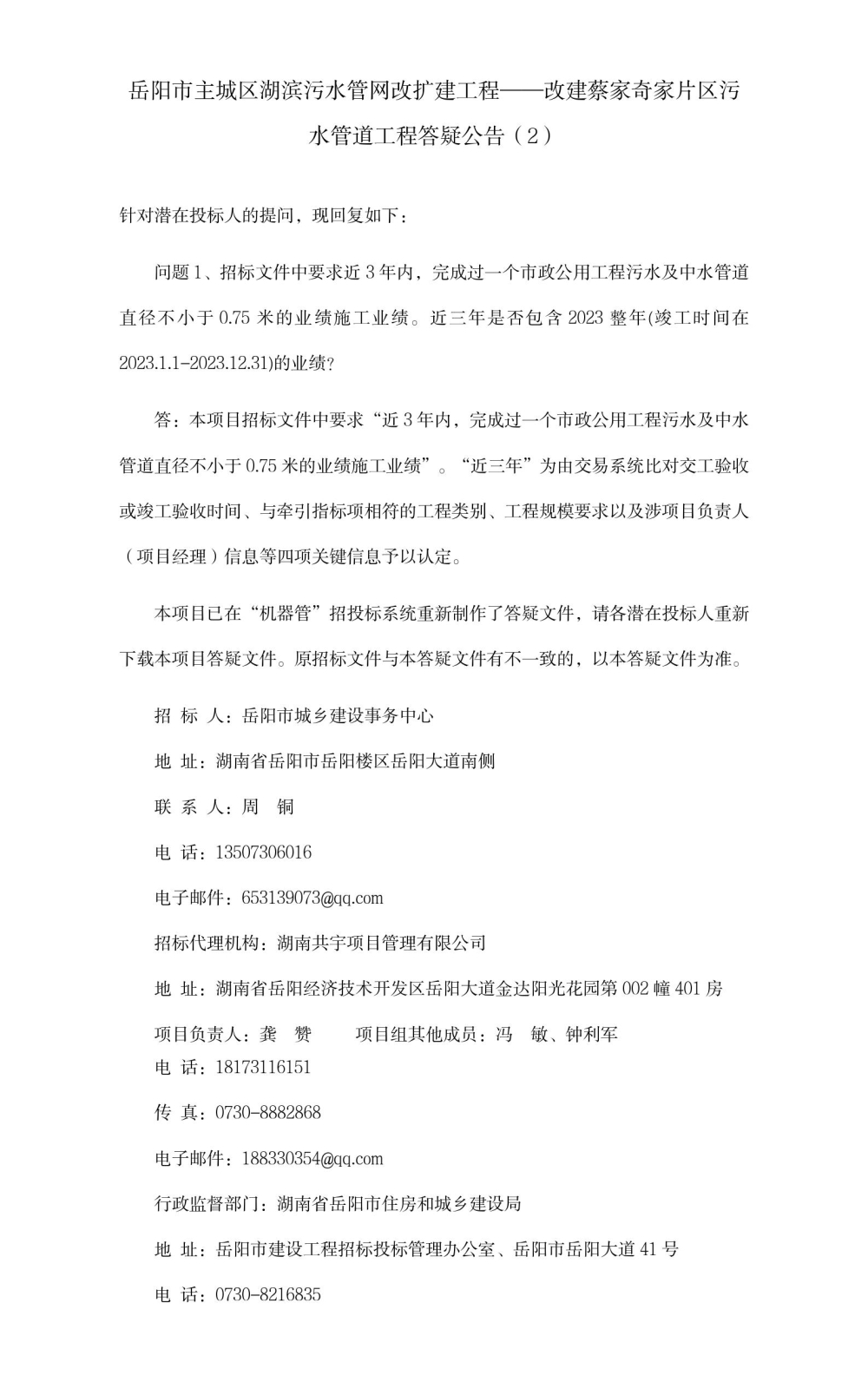 岳阳市主城区湖滨污水管网改扩建工程——改建蔡家奇家片区污水管道工程答疑公告(2)