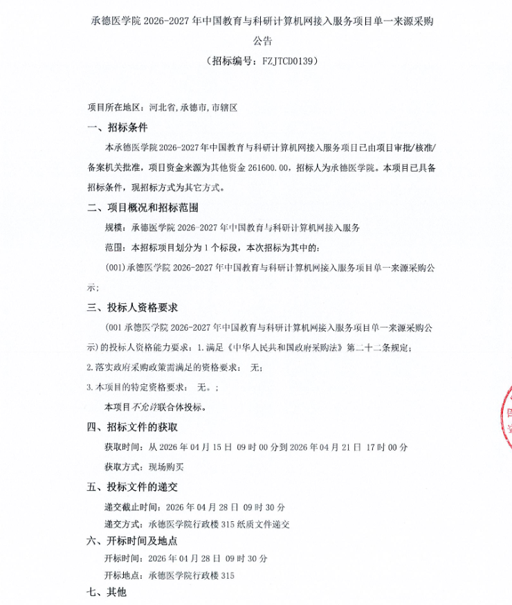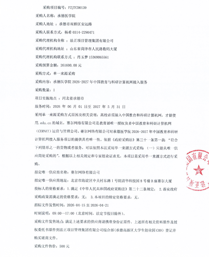 医学院2026-2027年中国教育与科研计算机网接入服务项目单一来源采购公告