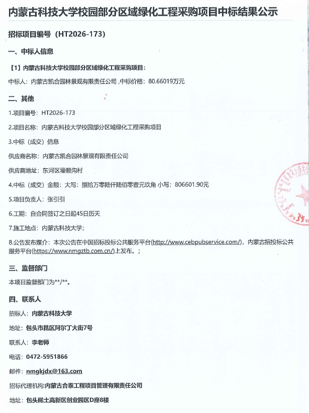 内蒙古科技大学校园部分区域绿化工程采购项目中标结果公示