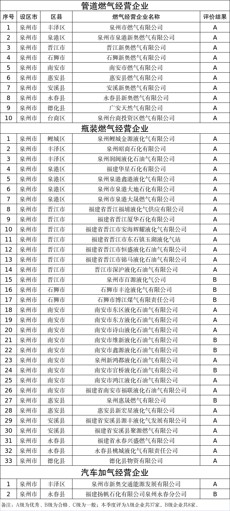 泉州市燃气经营企业****年第一季度信用评价结果公示