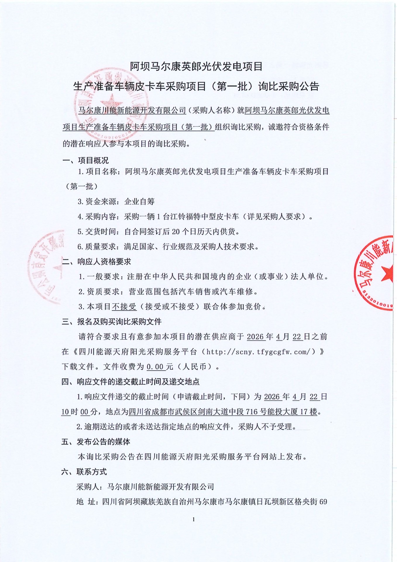 马尔康川能新能源开发有限公司关于阿坝马尔康英郎光伏发电项目生产准备车辆皮卡车采购项目(第一批)询比采购公告