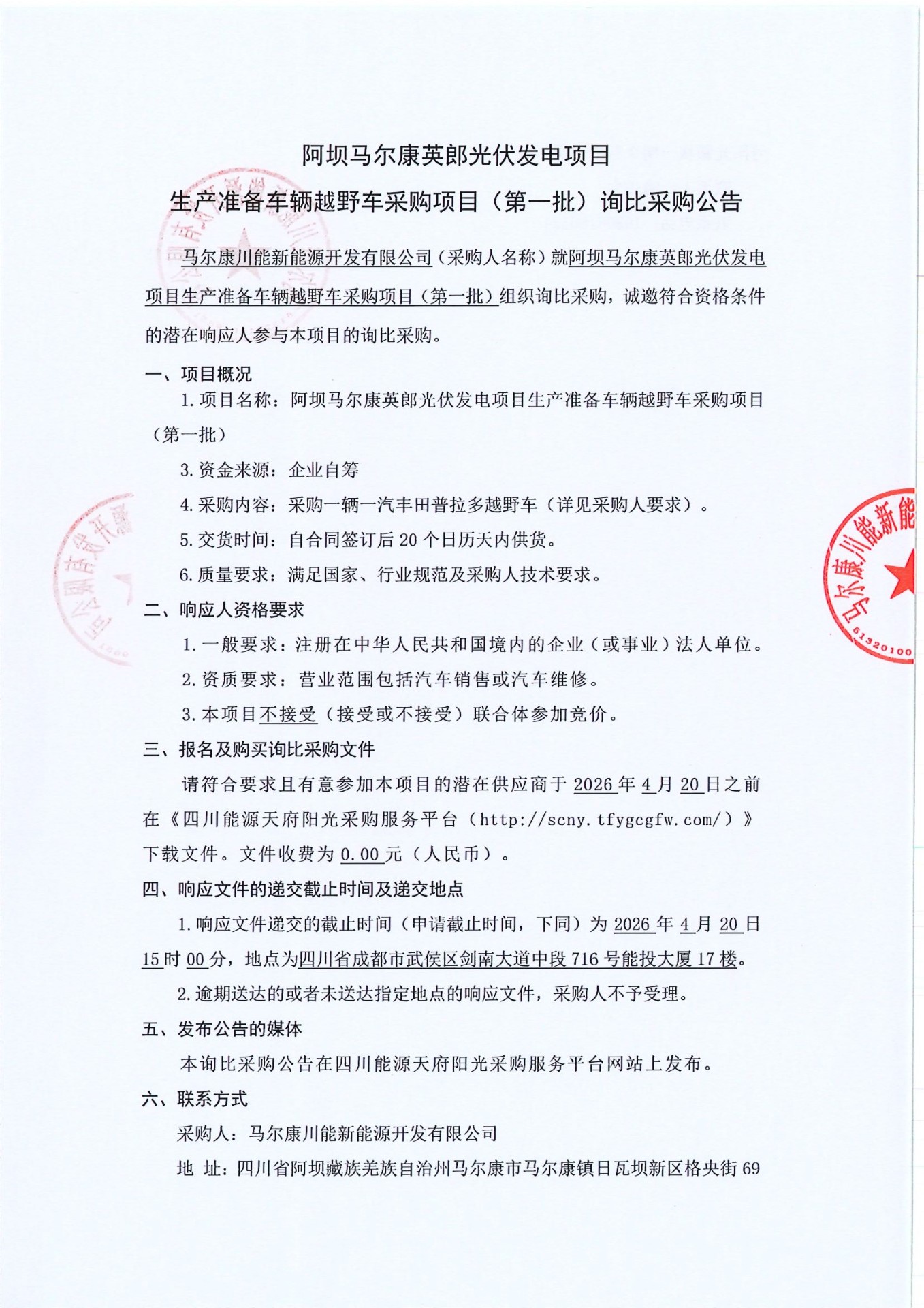 马尔康川能新能源开发有限公司关于阿坝马尔康英郎光伏发电项目生产准备车辆越野车采购项目(第一批)询比采购公告