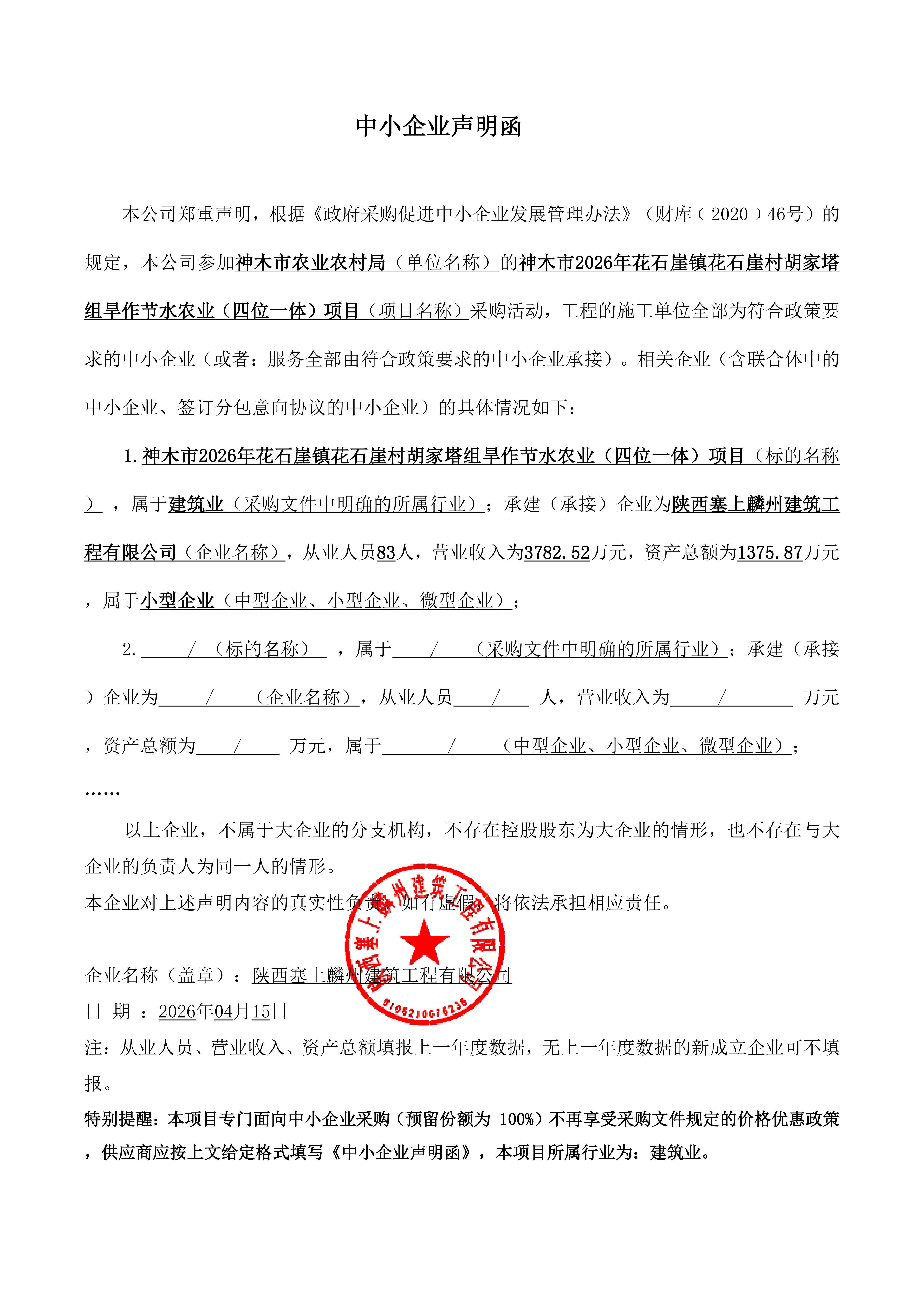 神木市农业农村局神木市2026年花石崖镇花石崖村胡家塔组旱作节水农业(四位一体)项目中标(成交)结果公告