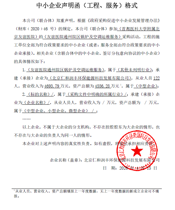 | 北京仁和润丰环保能源科技发展有限公司 | * | ***.*****万元 | ***.*****万元 | 全院冬季供暖主要采用市政热力;另院内设置有*台锅炉,分别为*台热水锅炉和*台蒸汽锅炉。其中,热水锅炉为全院提供生活热水,并作为所有区域过渡季采暖及手术室、专业医疗区非采暖季的热源;蒸汽锅炉为医院供应室消毒和手术室、专业医疗区空调加湿提供蒸汽。制冷机房内设有*台约克制冷机组,为医院提供各区空调和新风机组冷源使用。具体详见招标文件。 |