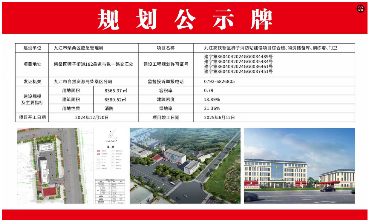 九江高铁新区狮子消防站建设项目综合楼、物资储备库、训练塔、门卫批后公示