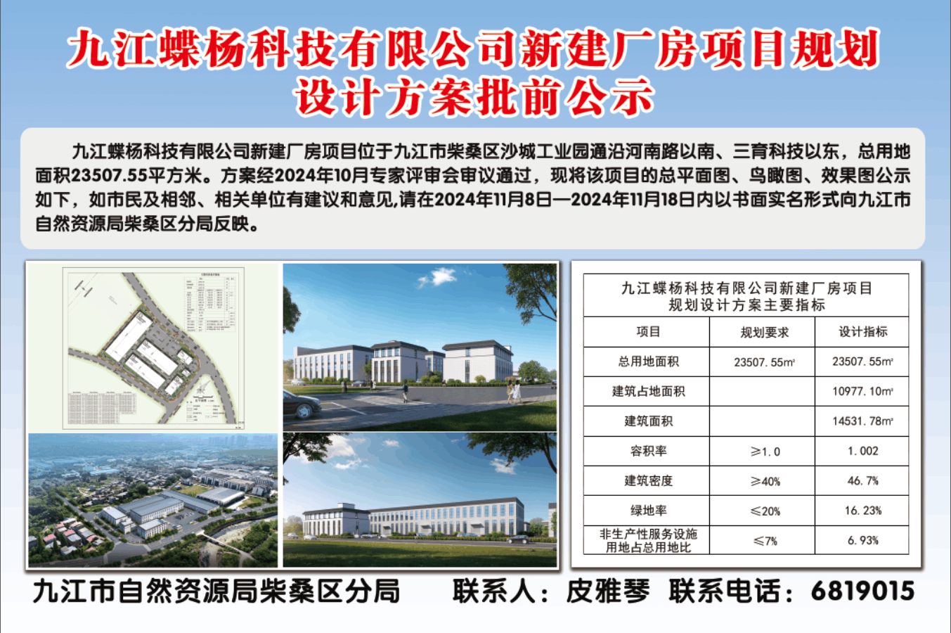 九江蝶杨科技有限公司新建厂房项目规划设计方案批前公示