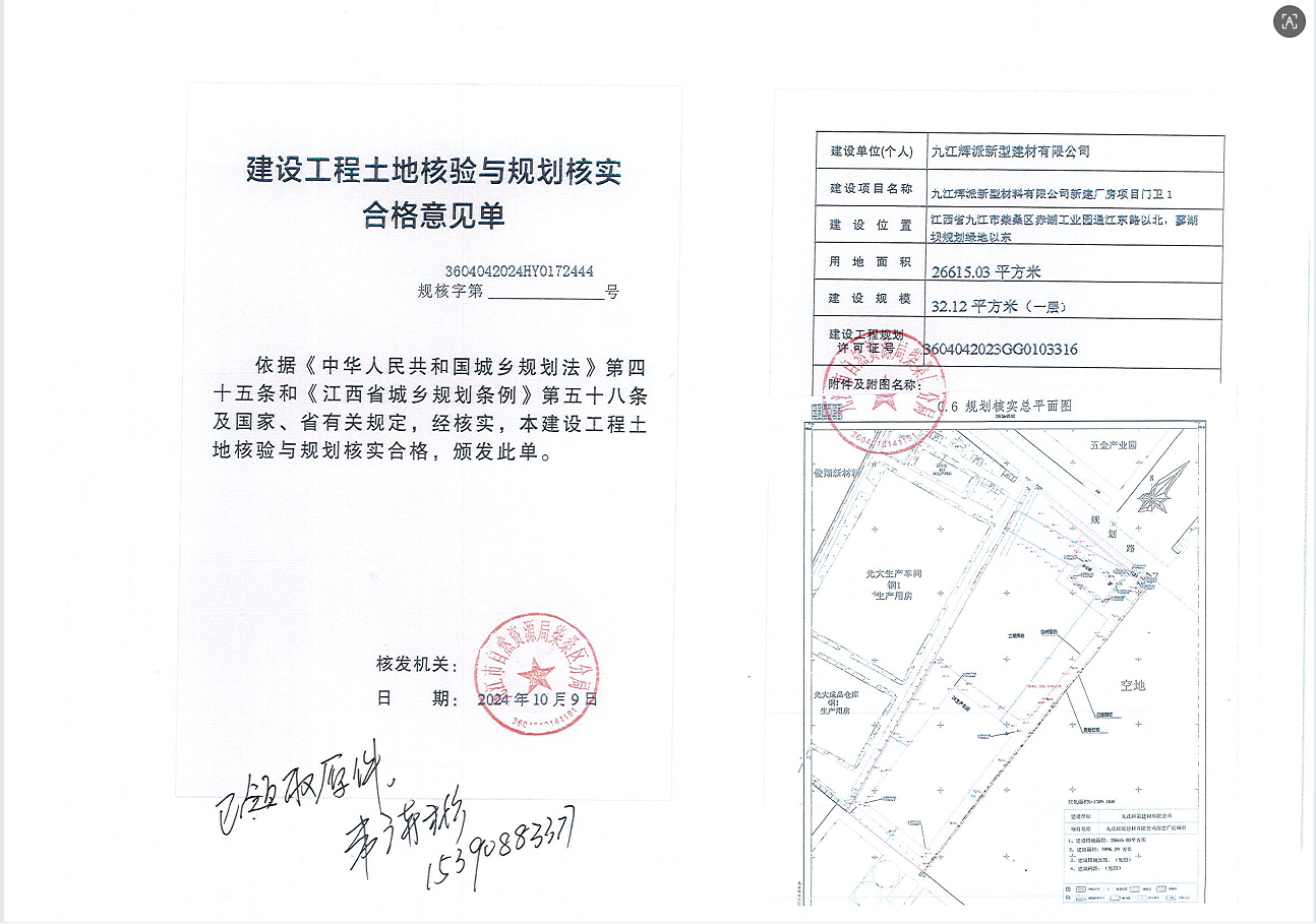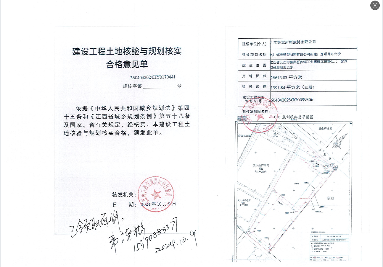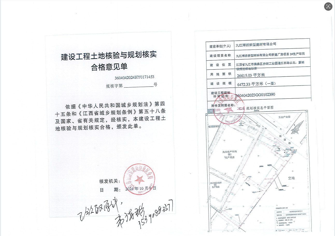 九江辉派新型建材有限公司新建厂房项目办公室、2#生产车间、门卫1土地核验与规划核实结果公示