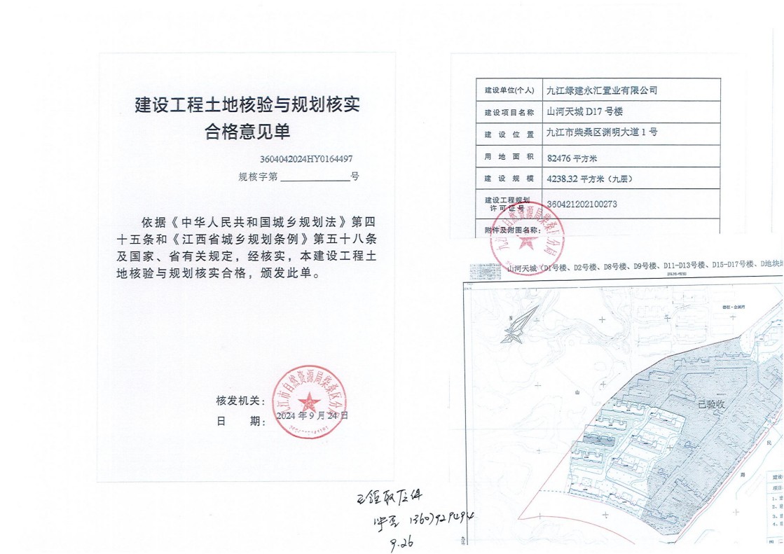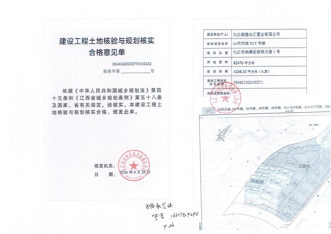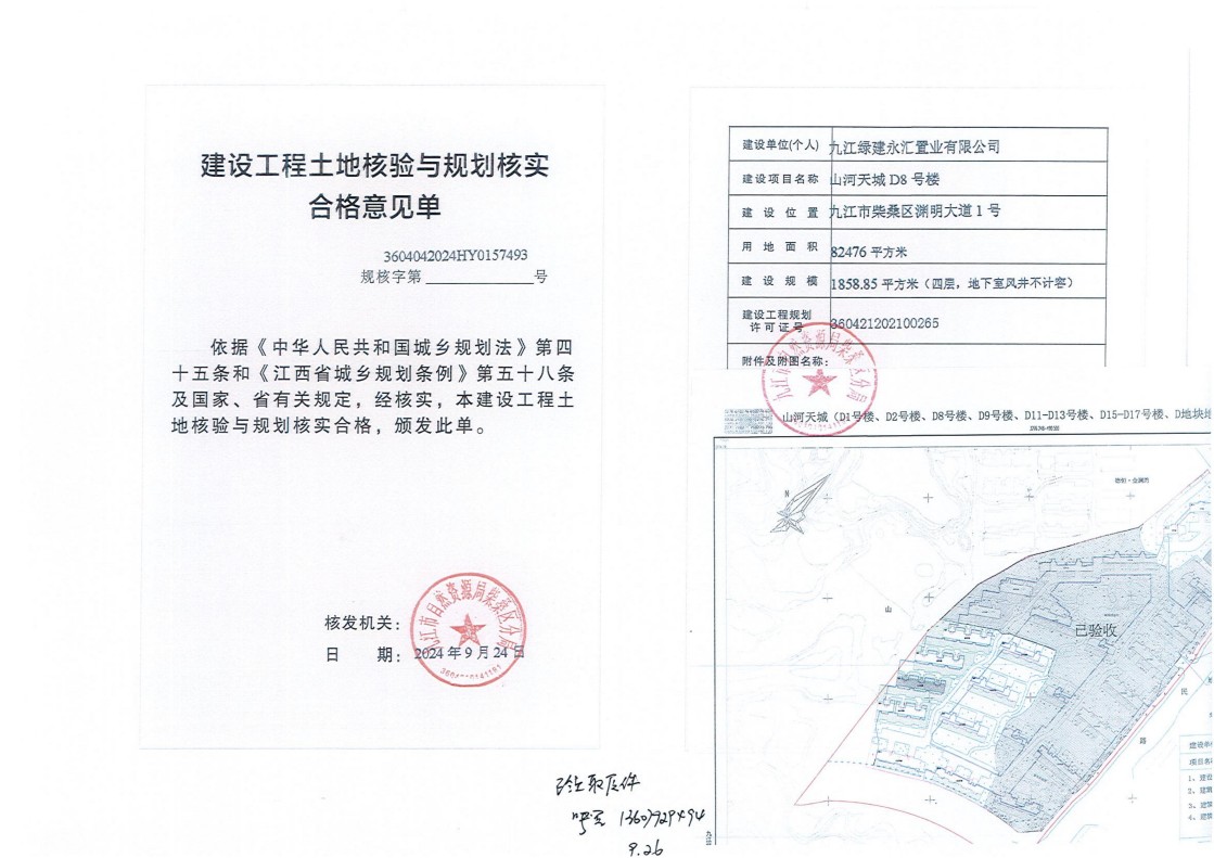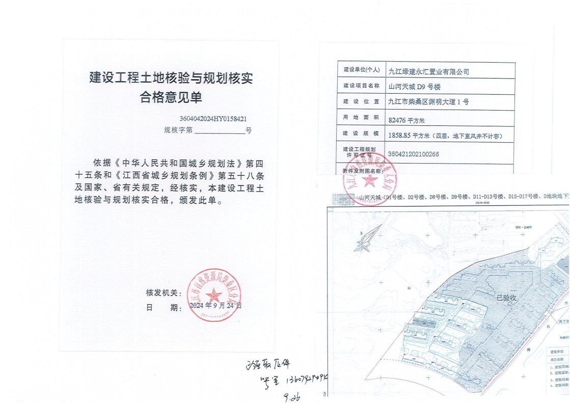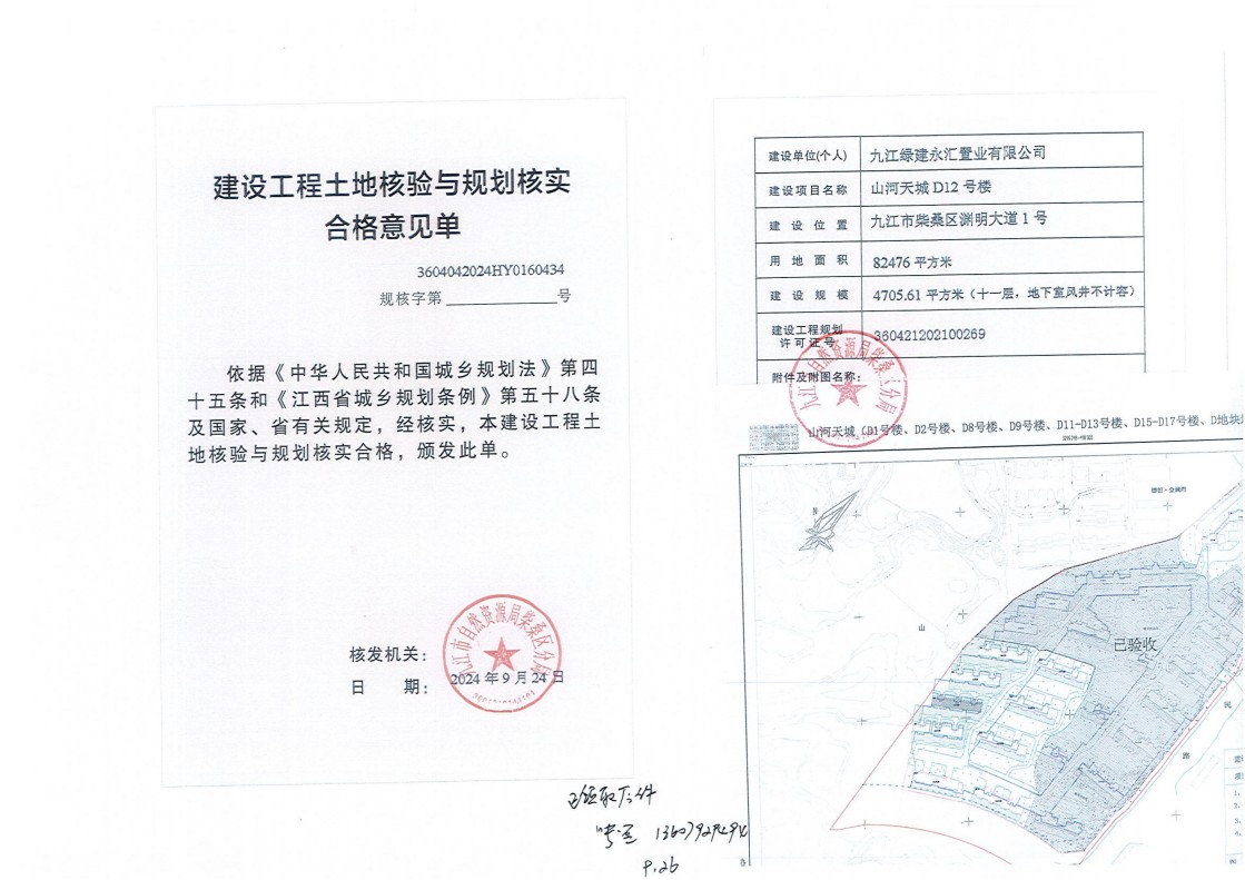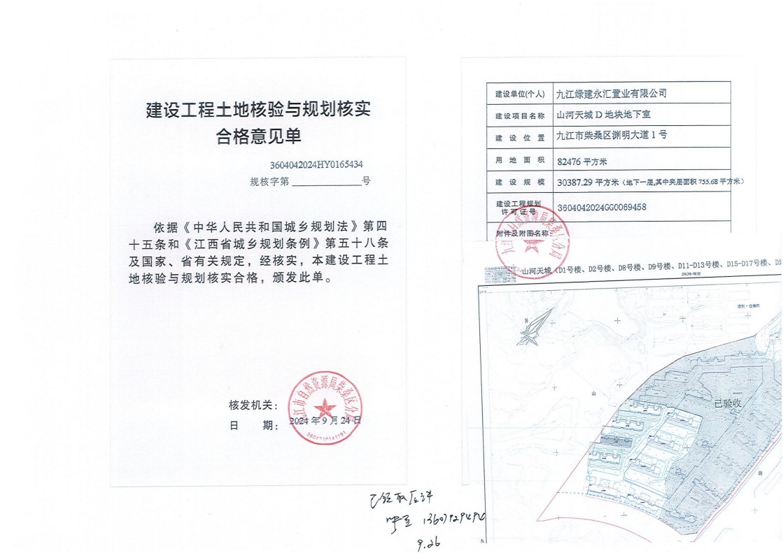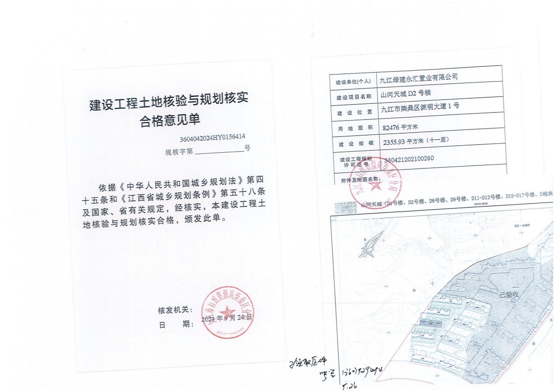 九江绿建永汇置业有限公司山河天城D1号、2号、8号、9号、11号-13号、15号-17号楼、D地块地下室土地核验与规划核实结果公示