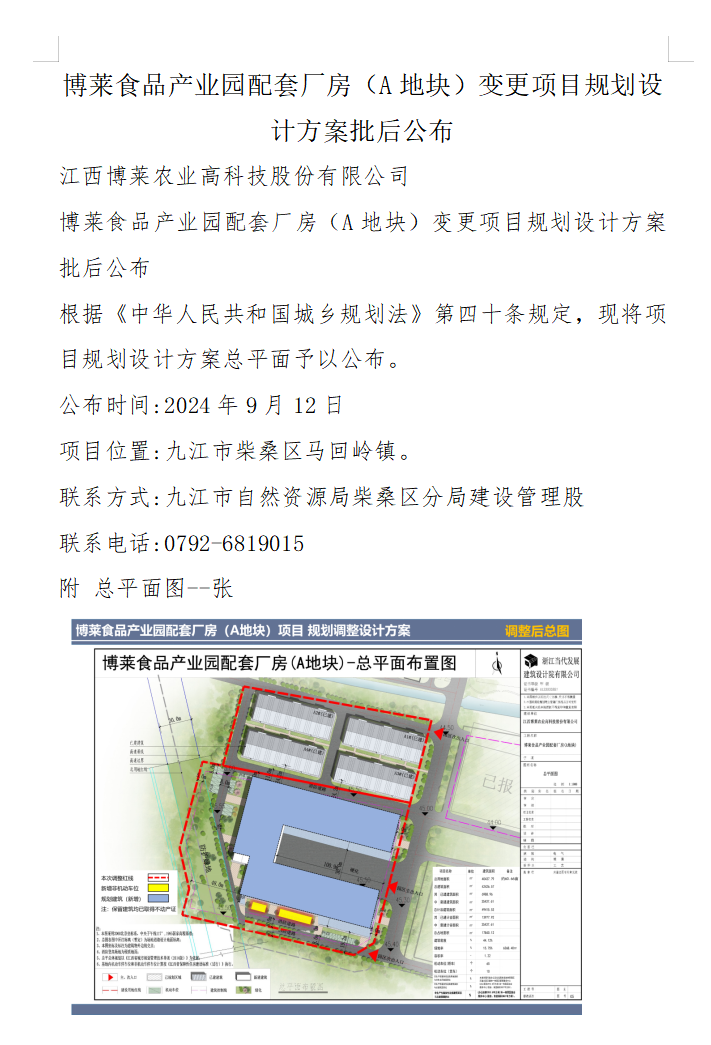 博莱食品产业园配套厂房(A地块)变更项目规划设计方案批后公布