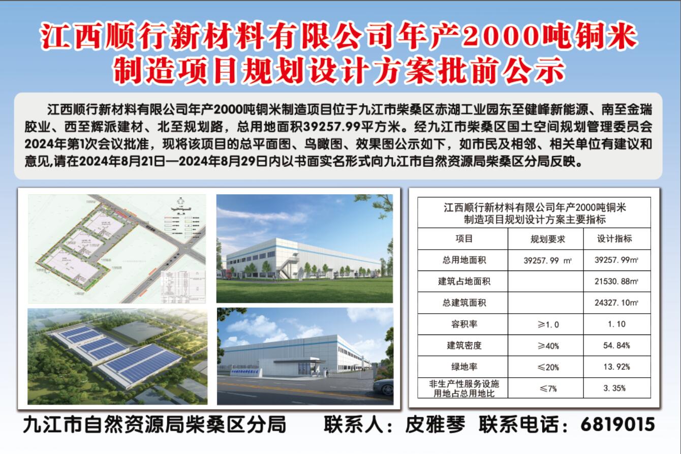 江西顺行新材料有限公司年产2000吨铜米制造项目规划设计方案批前公示