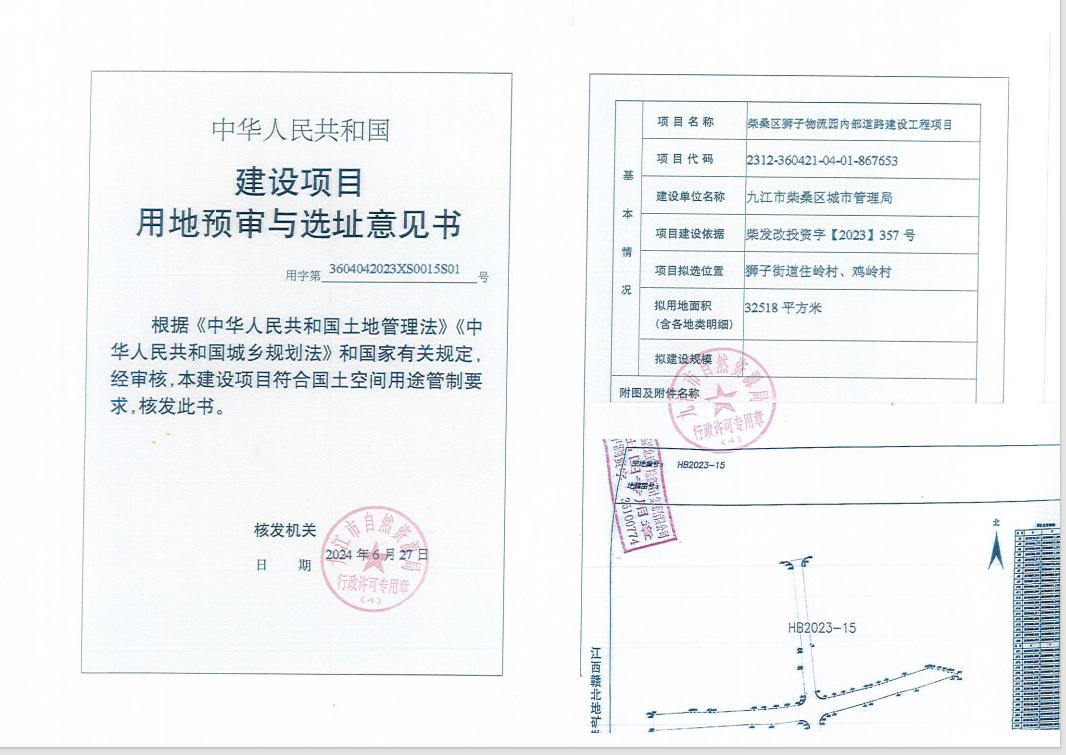 柴桑区狮子物流园内部道路建设工程项目用地预审与选址意见书批准结果公示