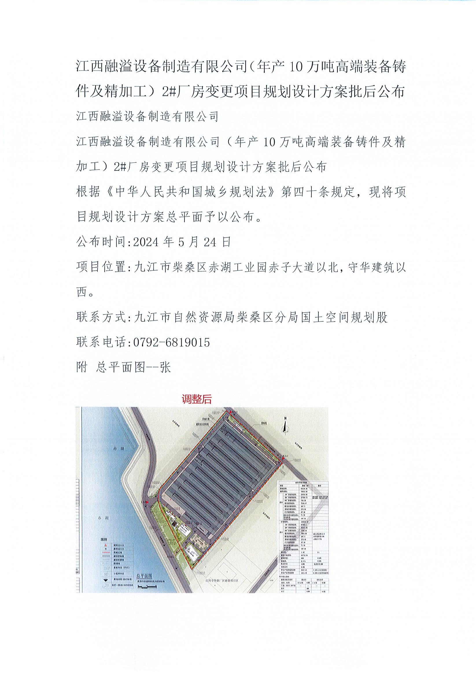 江西融溢设备制造有限公司(年产10万吨高端装备铸件及精加工)2#厂房变更项目规划设计方案批后公布