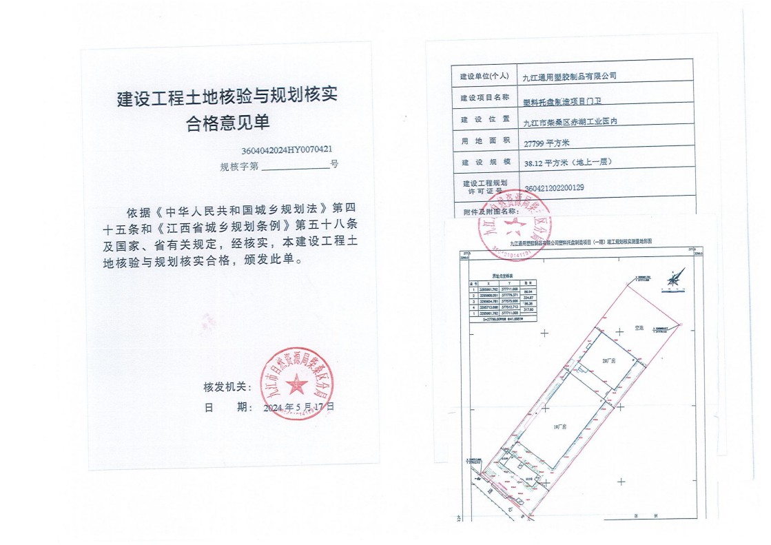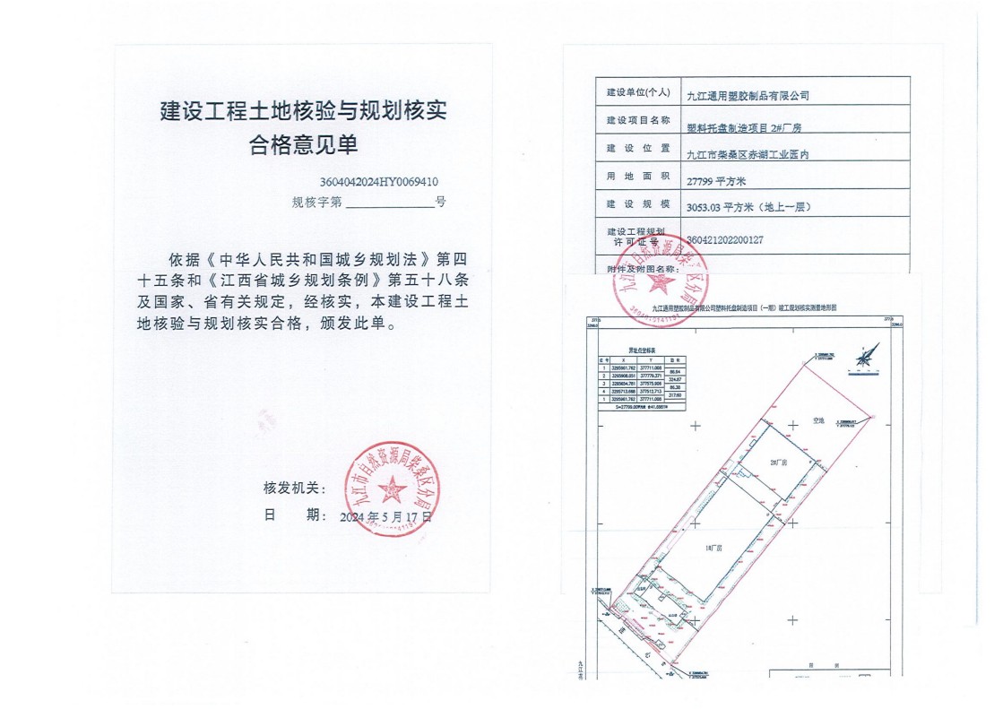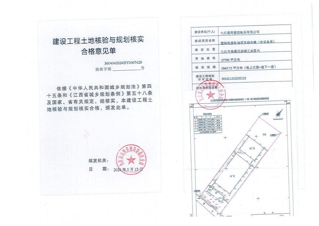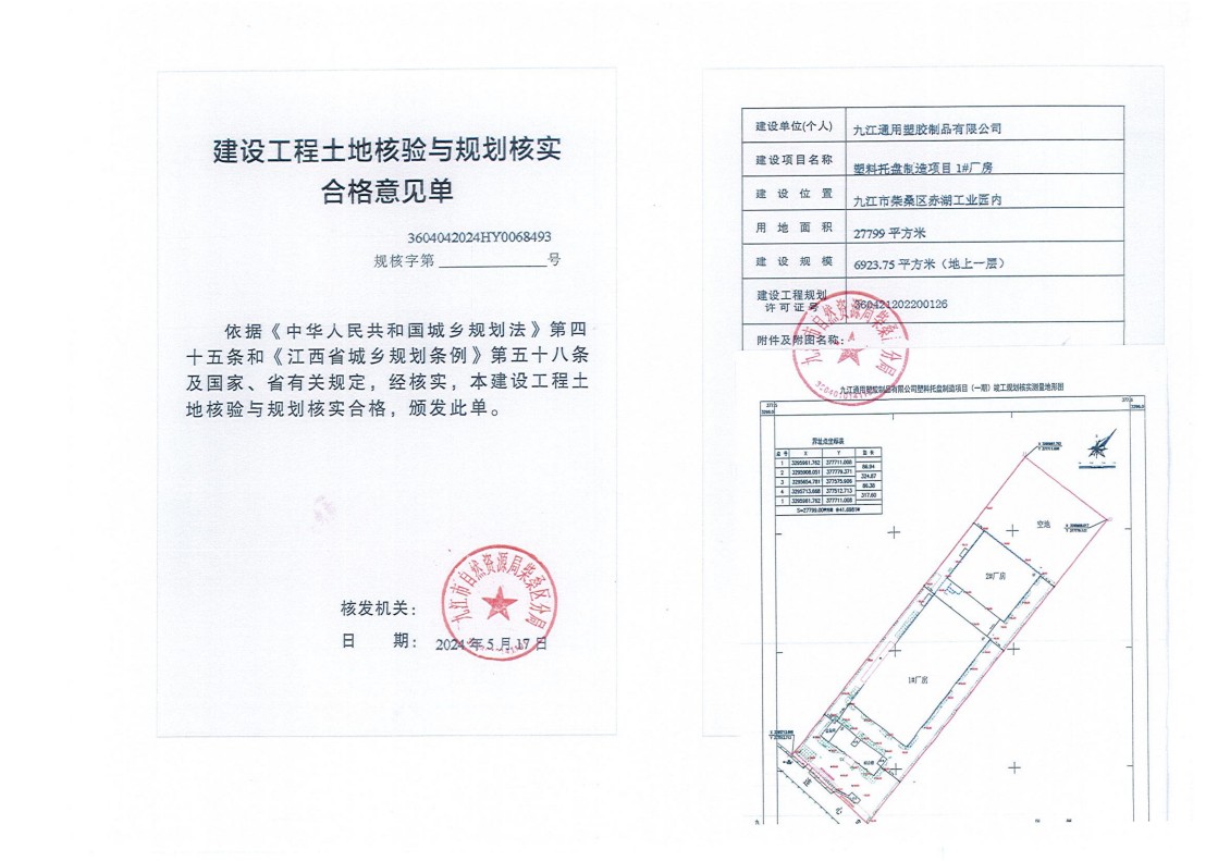 九江通用塑胶制品有限公司塑料托盘制造项目综合楼(含设备用房)、1#厂房、2#厂房、门卫土地核验与规划核实结果公示