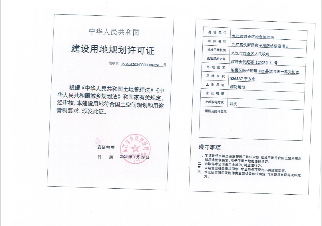 九江高铁新区狮子消防站建设项目用地规划许可证批准结果公示