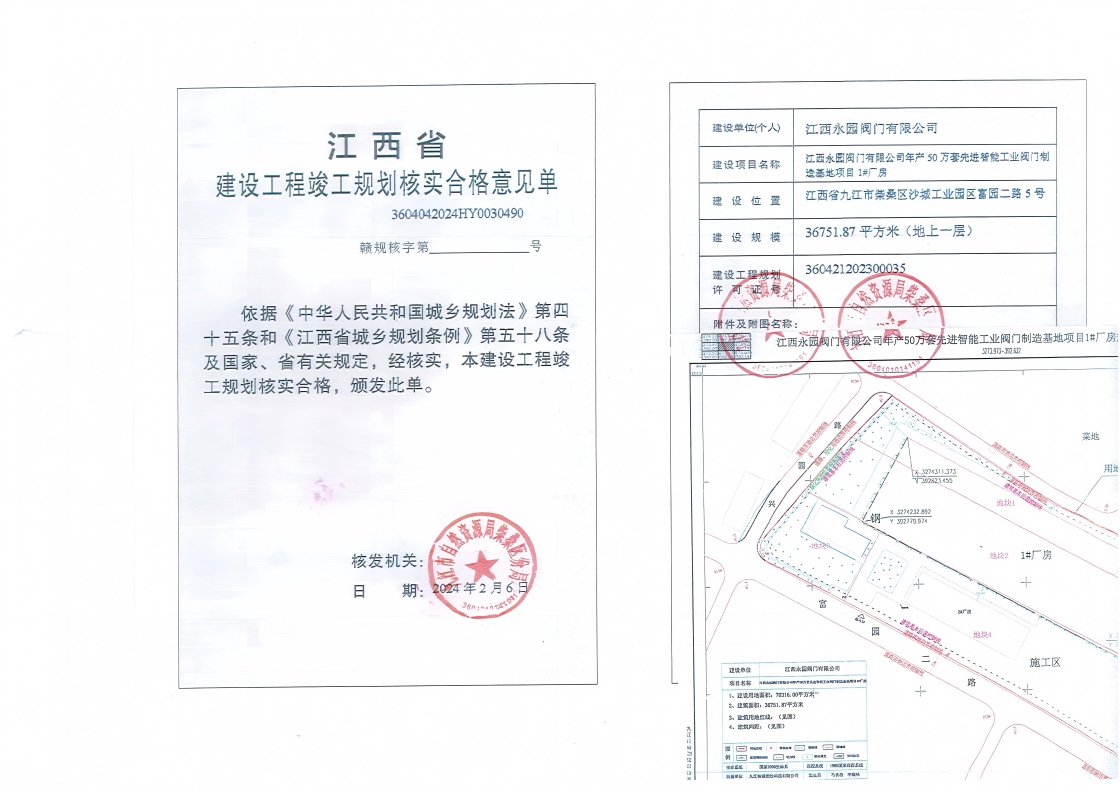 江西永园阀门有限公司年产50万套先进智能工业阀门制造基地项目1#厂房土地核验与规划核实结果公示