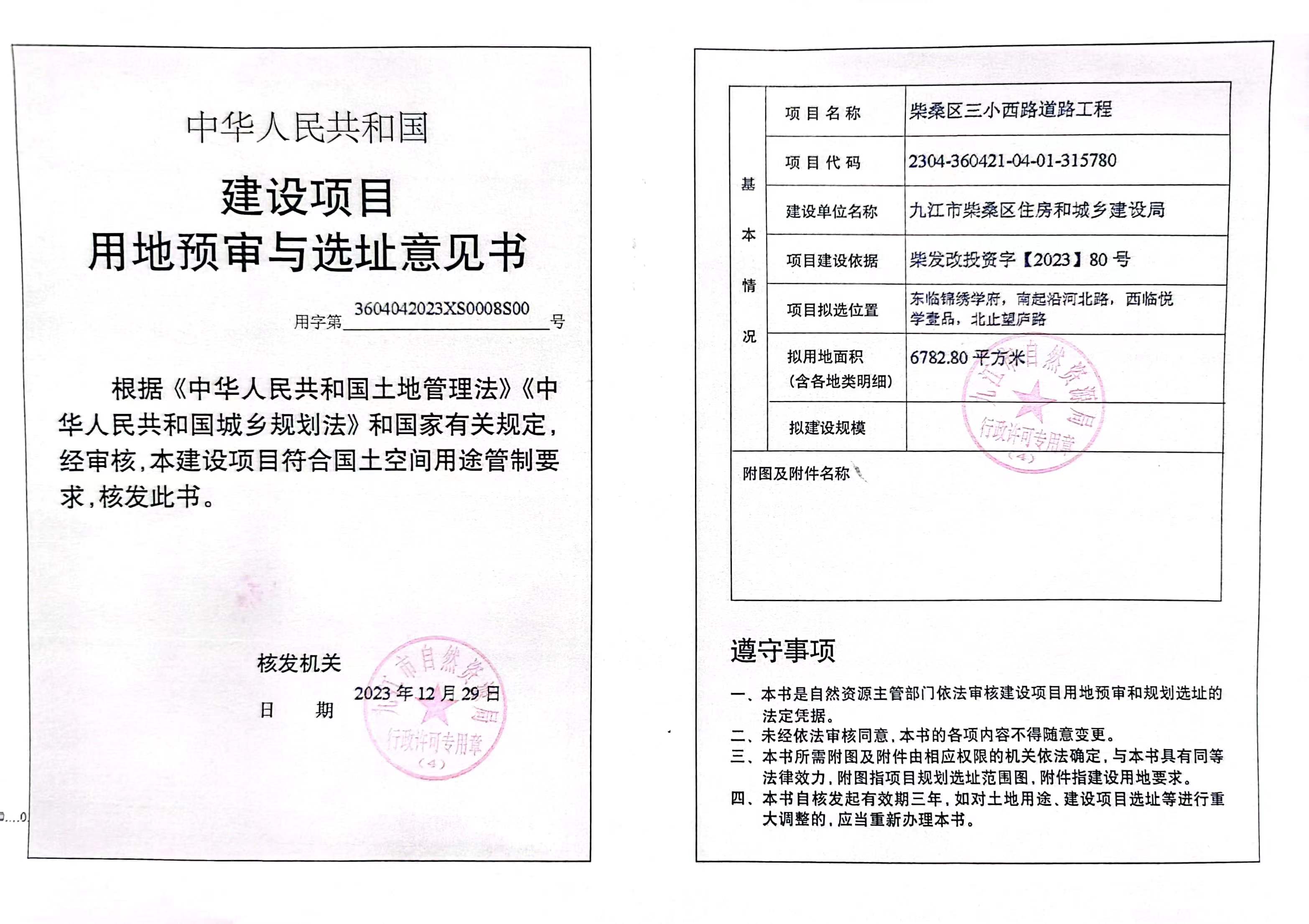 柴桑区三小西路道路工程项目用地预审与选址意见书批准结果公示