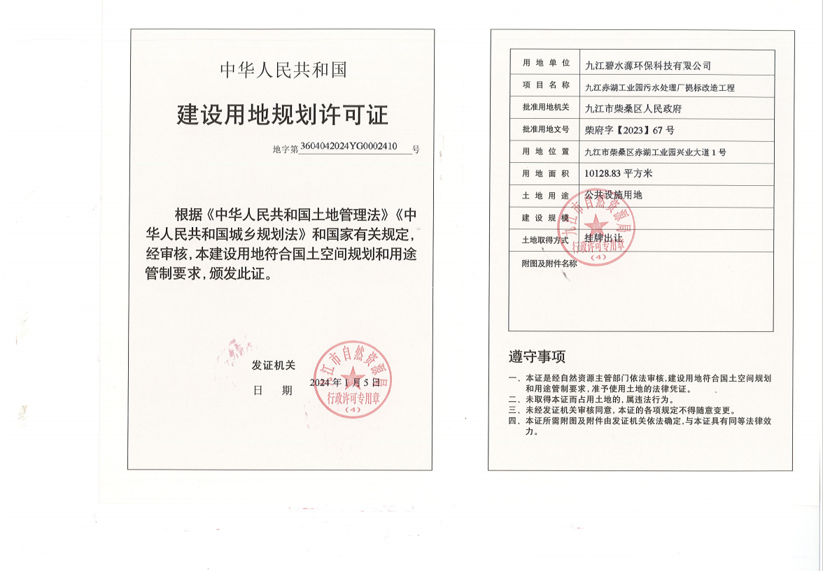 九江赤湖工业园污水处理厂提标改造工程项目建设用地规划许可证批准结果公示