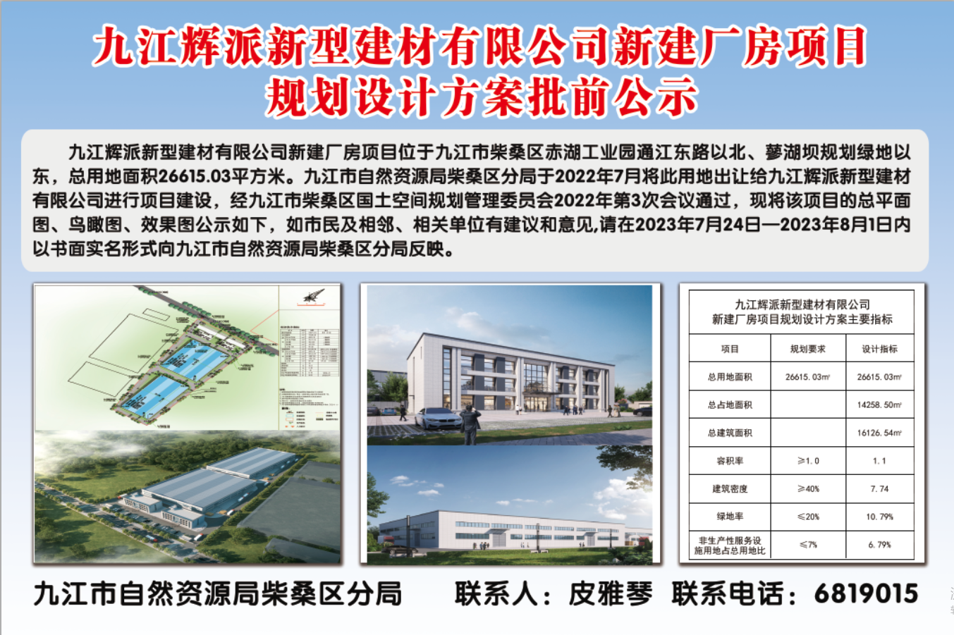 九江辉派新型建材有限公司新建厂房项目规划设计方案批前公示