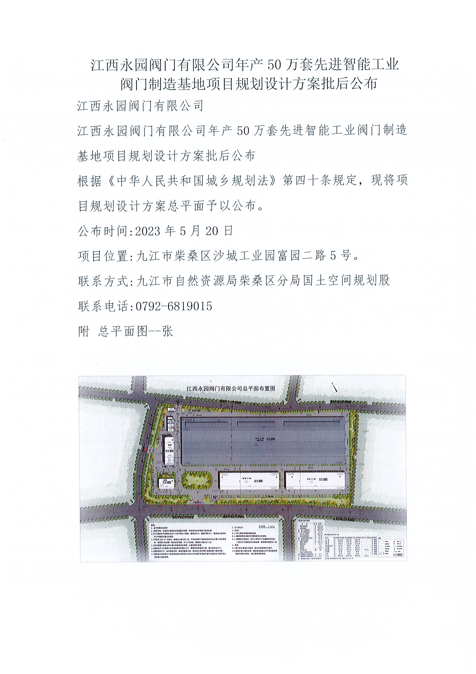 江西永园阀门有限公司年产50万套先进智能工业阀门制造基地项目规划设计方案批后公布