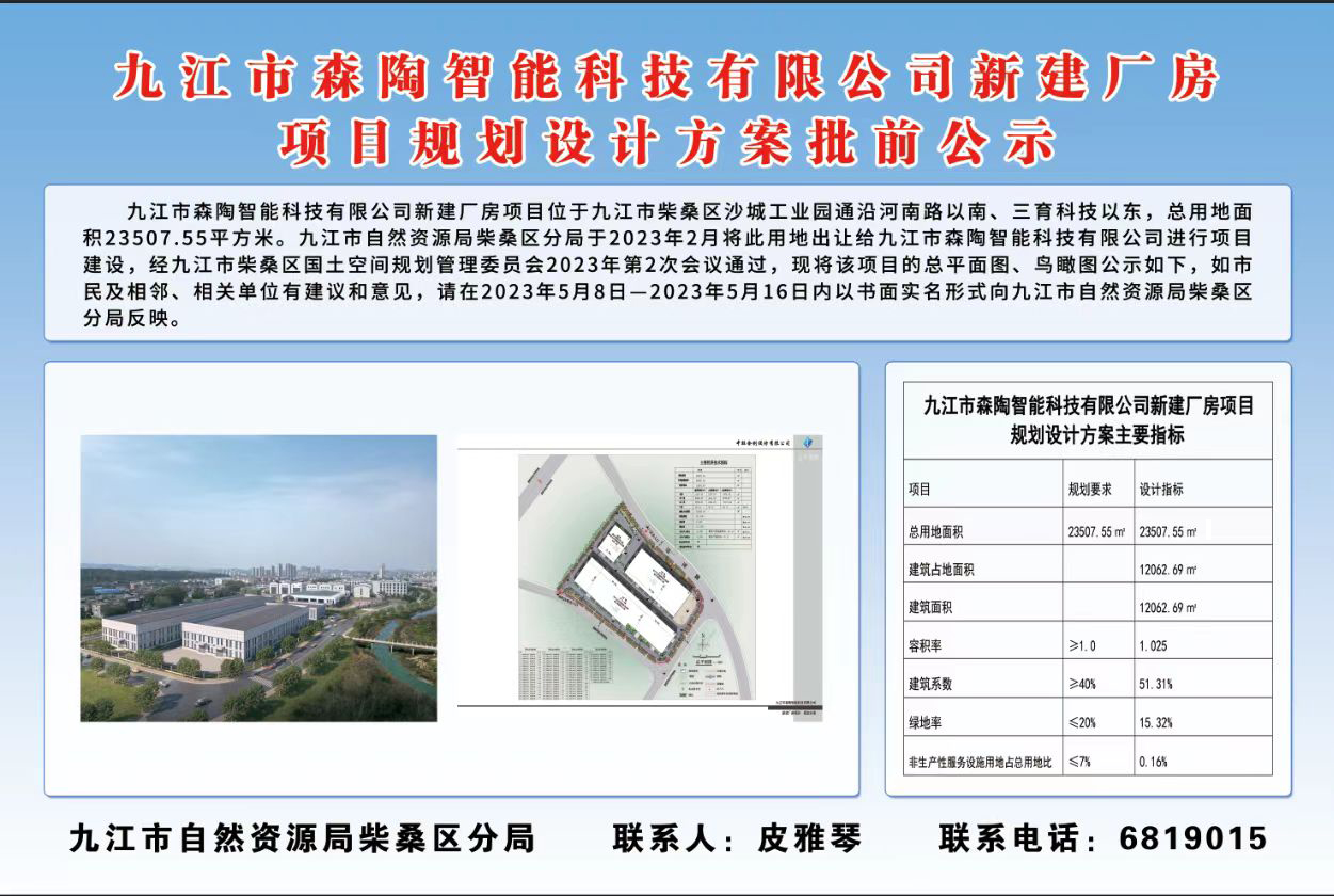 九江市森陶智能科技有限公司新建厂房项目规划设计方案批前公示