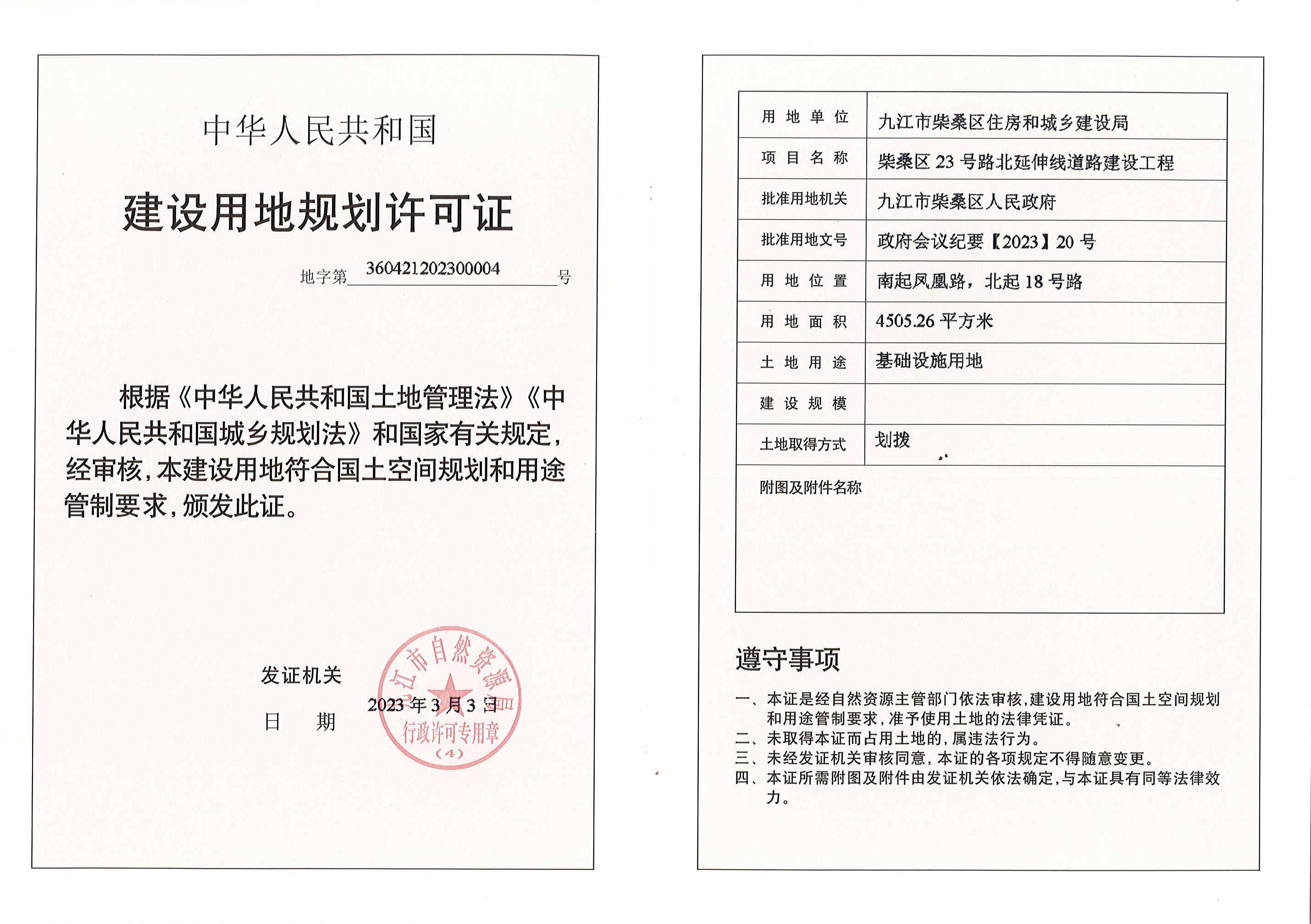 柴桑区23号路北延伸线道路工程项目建设用地规划许可证批准结果公示