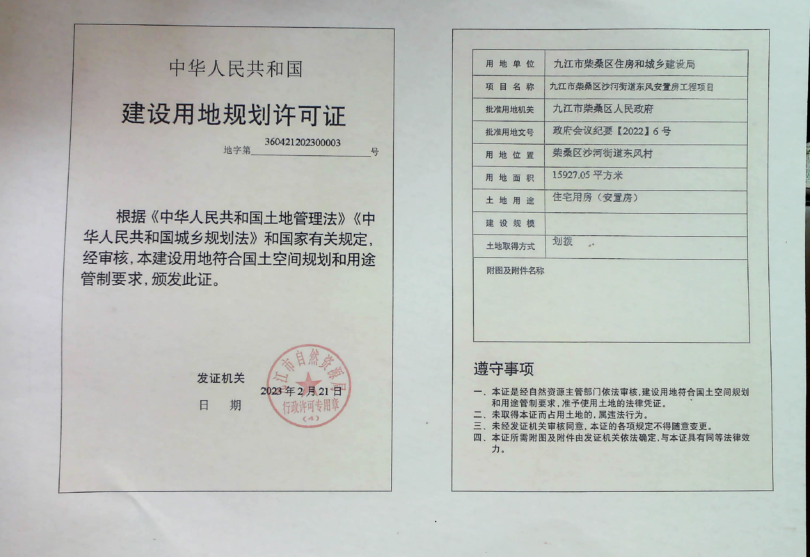 沙河街道东风安置房工程项目建设用地规划许可证批准结果公示