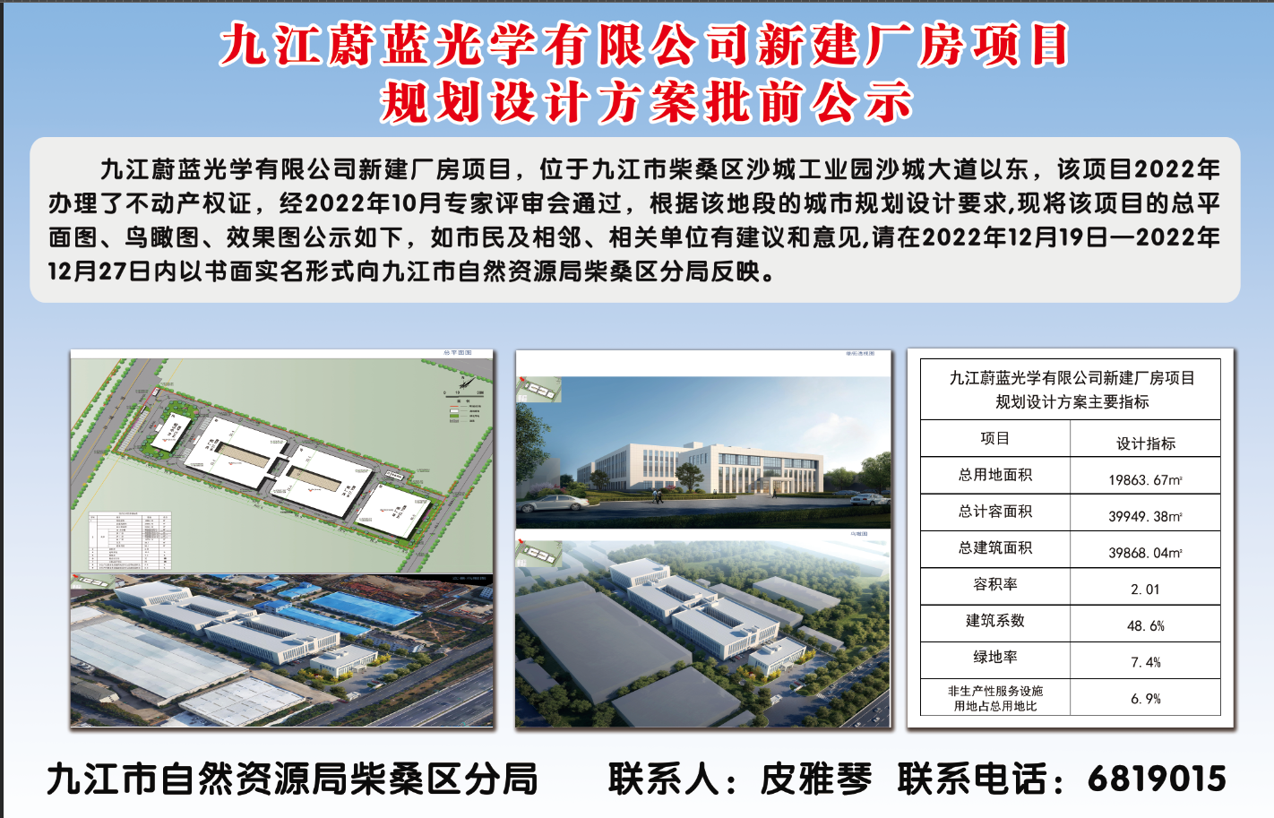 九江蔚蓝光学有限公司新建厂房项目规划设计方案批前公示