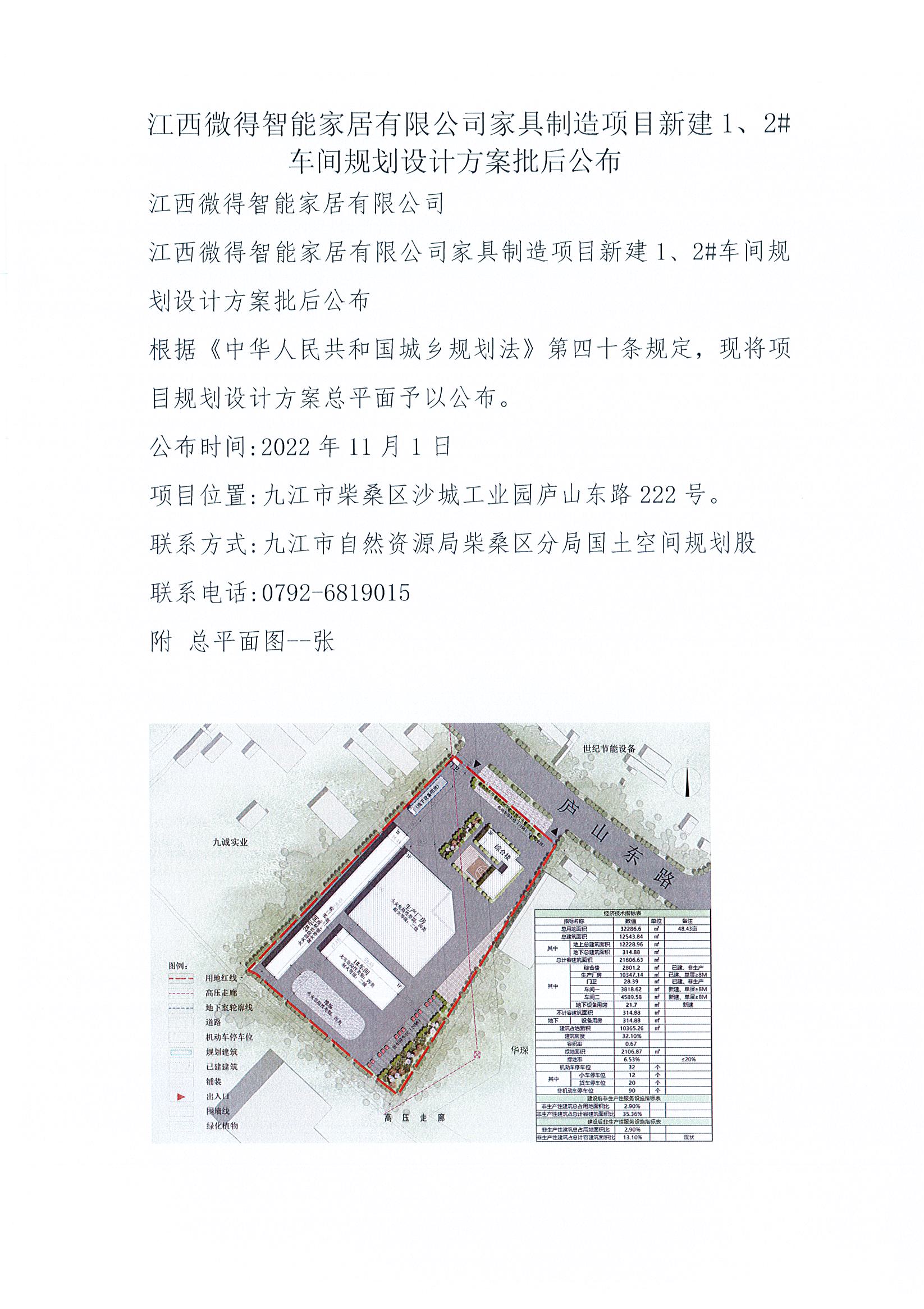 江西微得智能家居有限公司家具制造项目新建1、2#车间规划设计方案批后公布