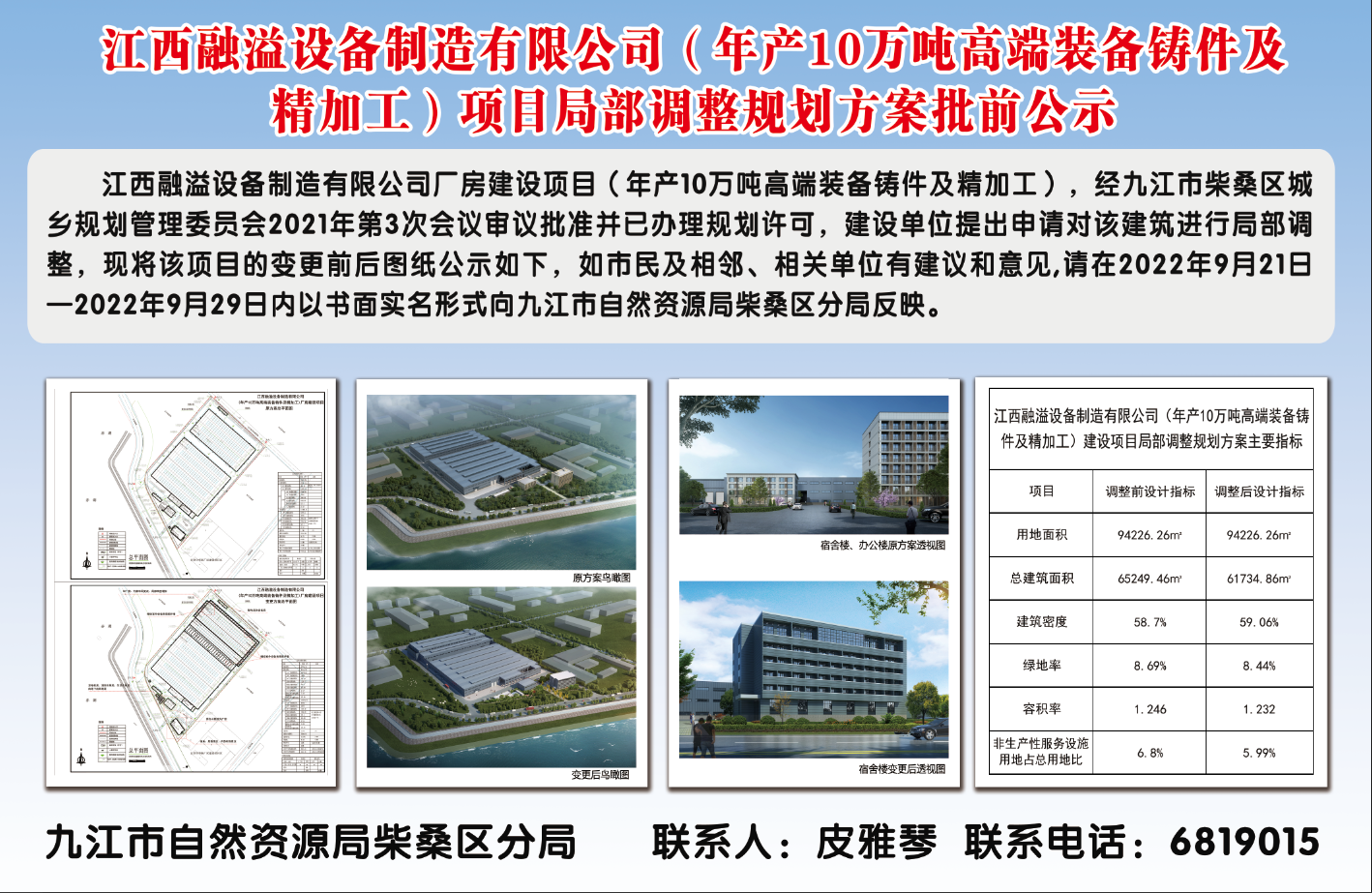 江西融溢设备制造有限公司(年产10万吨高端装备铸件及精加工)项目局部调整规划方案批前公示