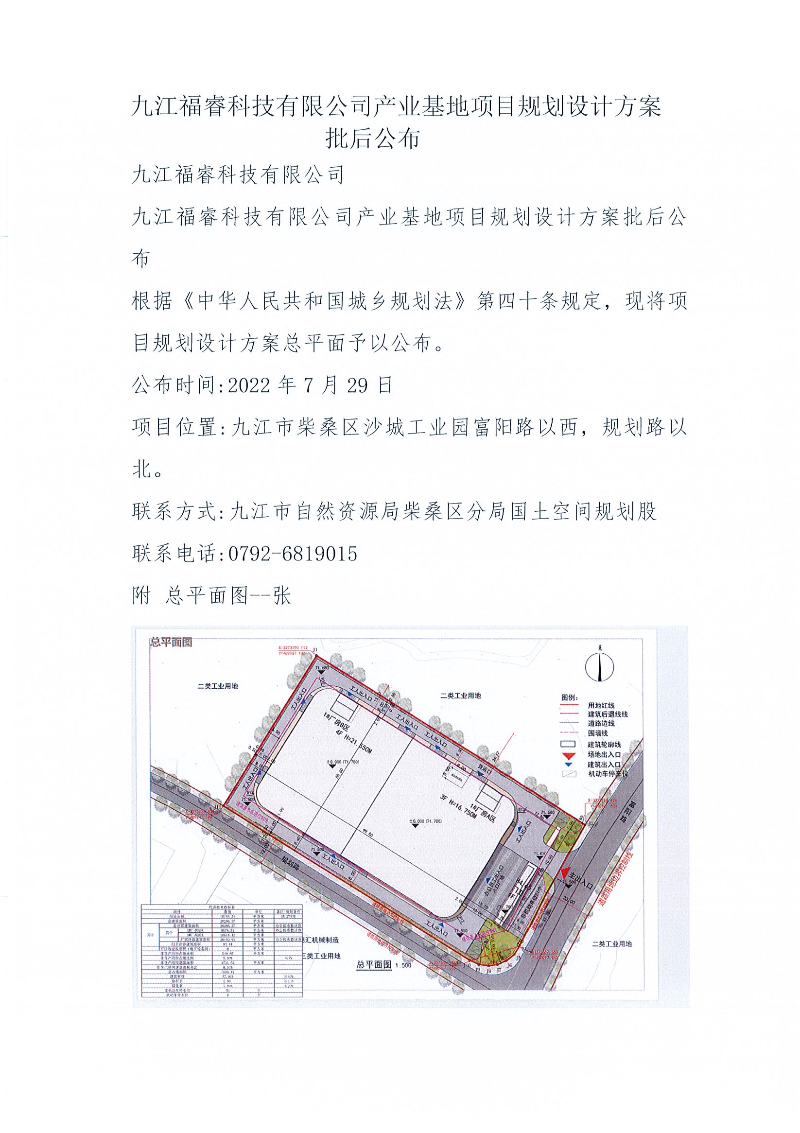 九江福睿科技有限公司产业基地项目规划设计方案批后公布