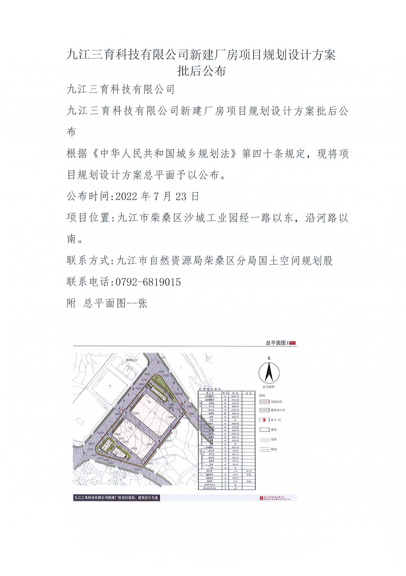 九江三育科技有限公司新建厂房项目规划设计方案批后公布