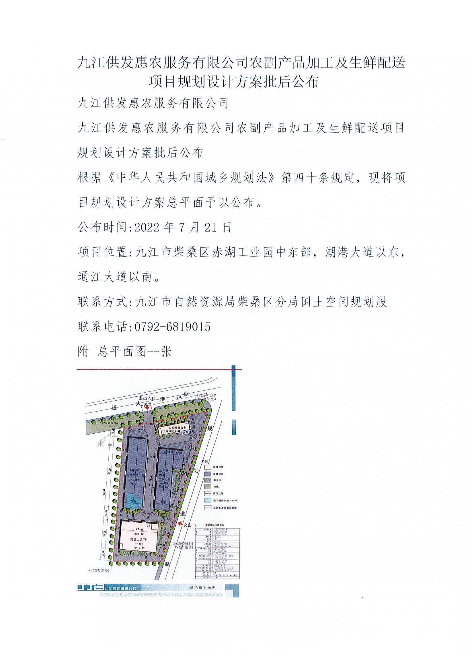 九江供发惠农服务有限公司农副产品加工及生鲜配送项目规划设计方案批后公布