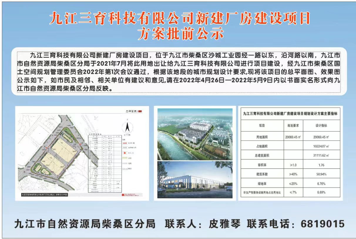 九江三育科技有限公司新建厂房建设项目方案批前公示