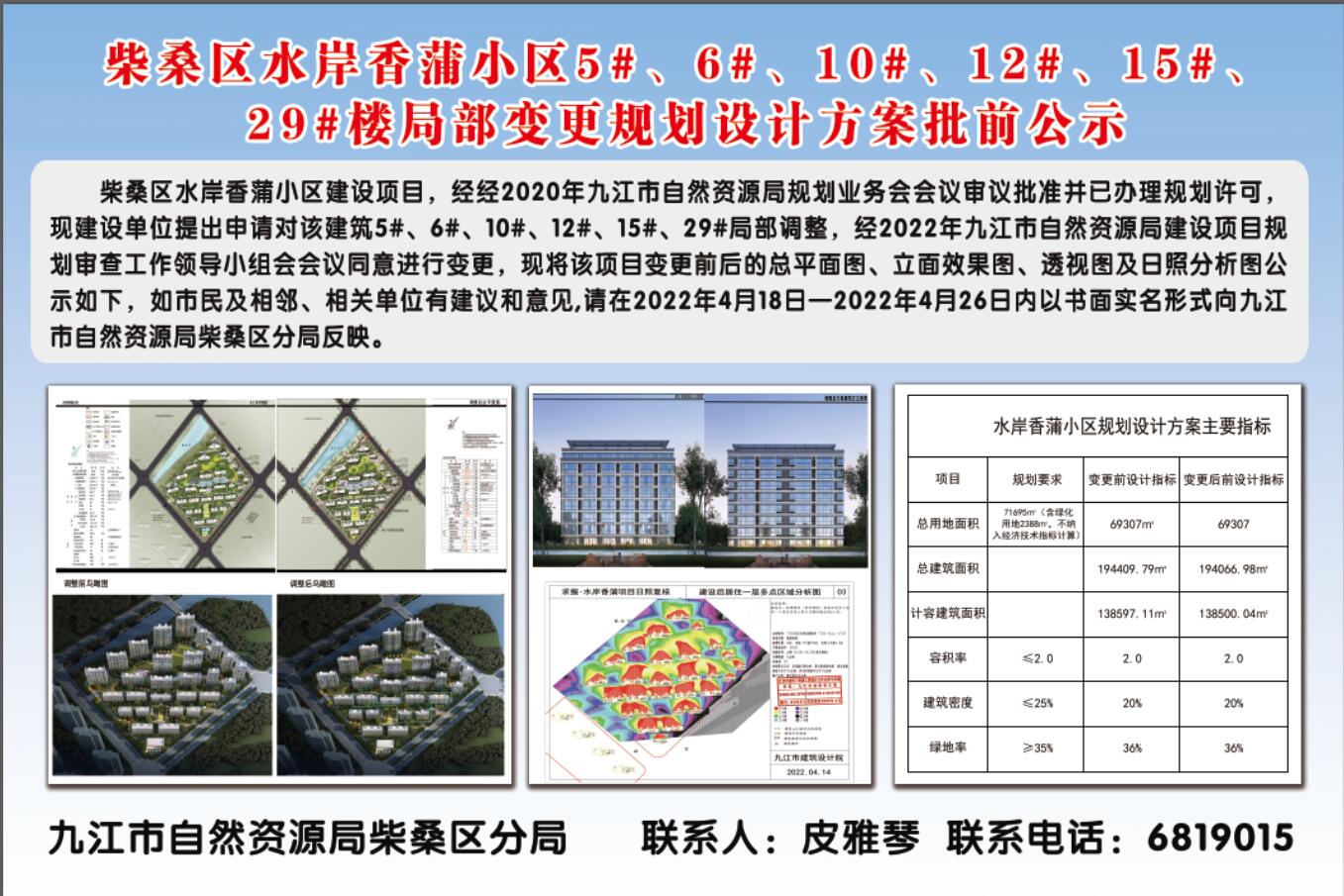 柴桑区水岸香蒲小区5#、6#、10#、12#、15#、29#楼局部变更规划设计方案批前公示