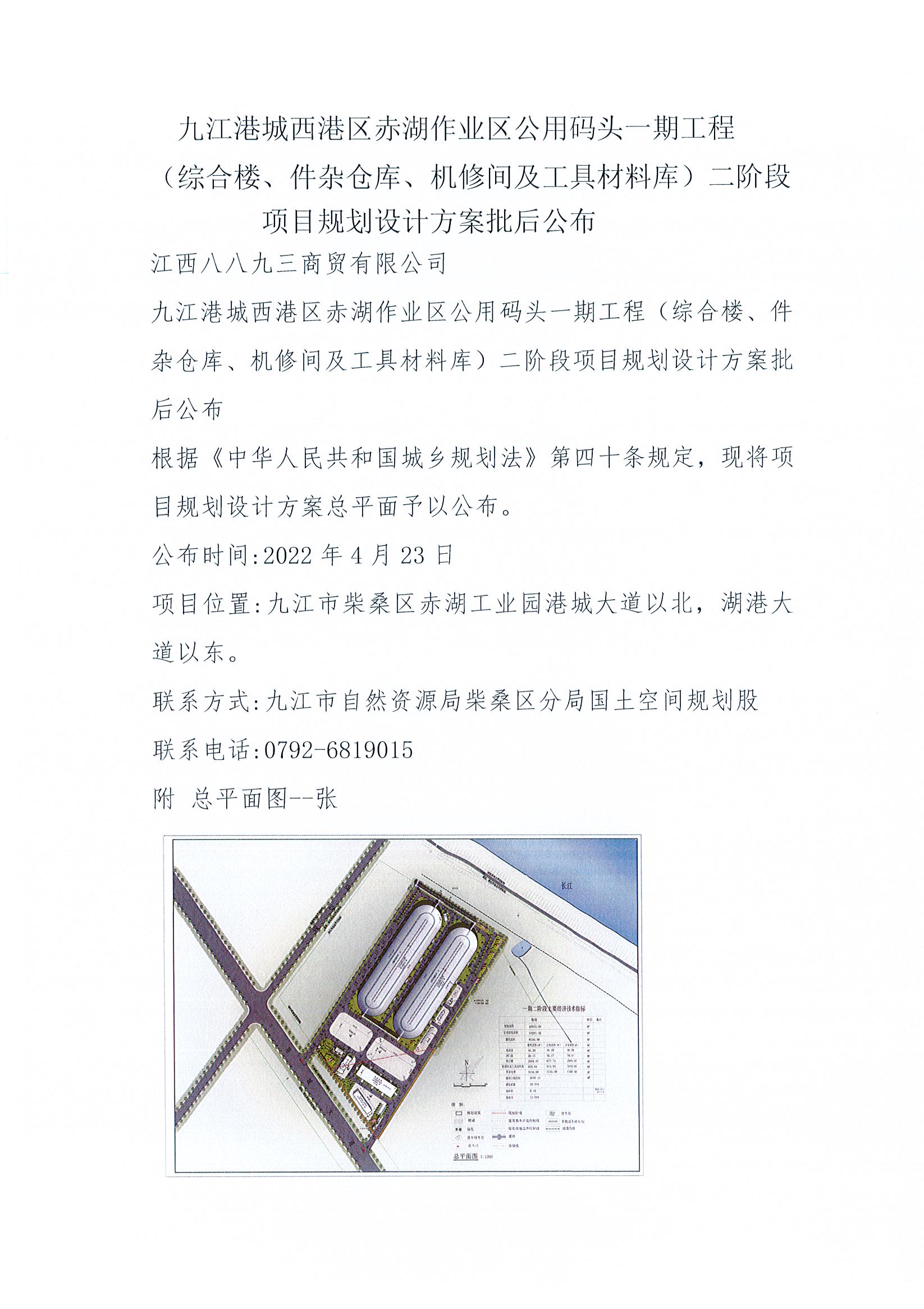 九江港城西港区赤湖作业区公用码头一期工程(综合楼、件杂仓库、机修间及工具材料库)二阶段项目规划设计方案批后公布