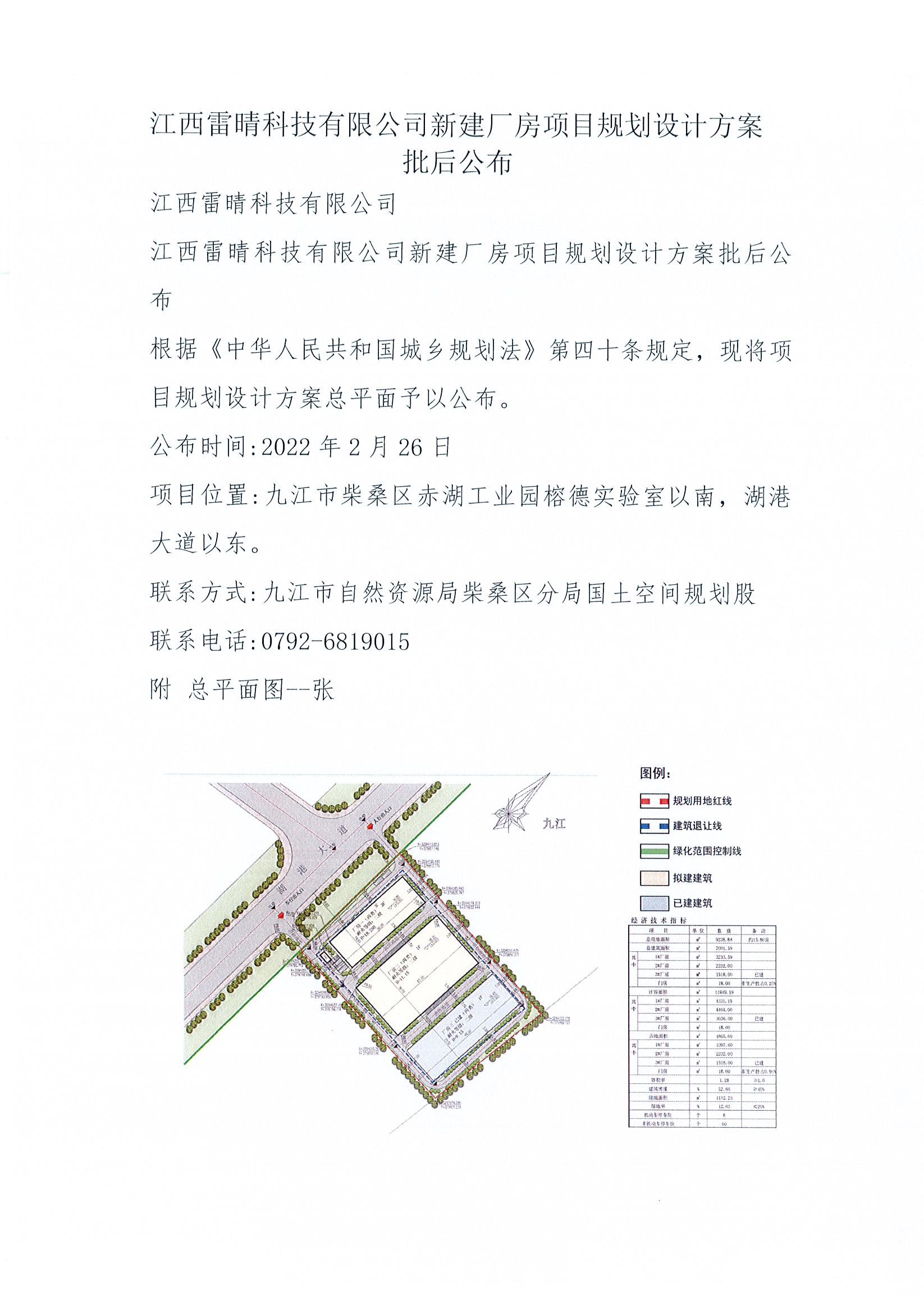 江西雷晴科技有限公司新建厂房项目规划设计方案批后公布