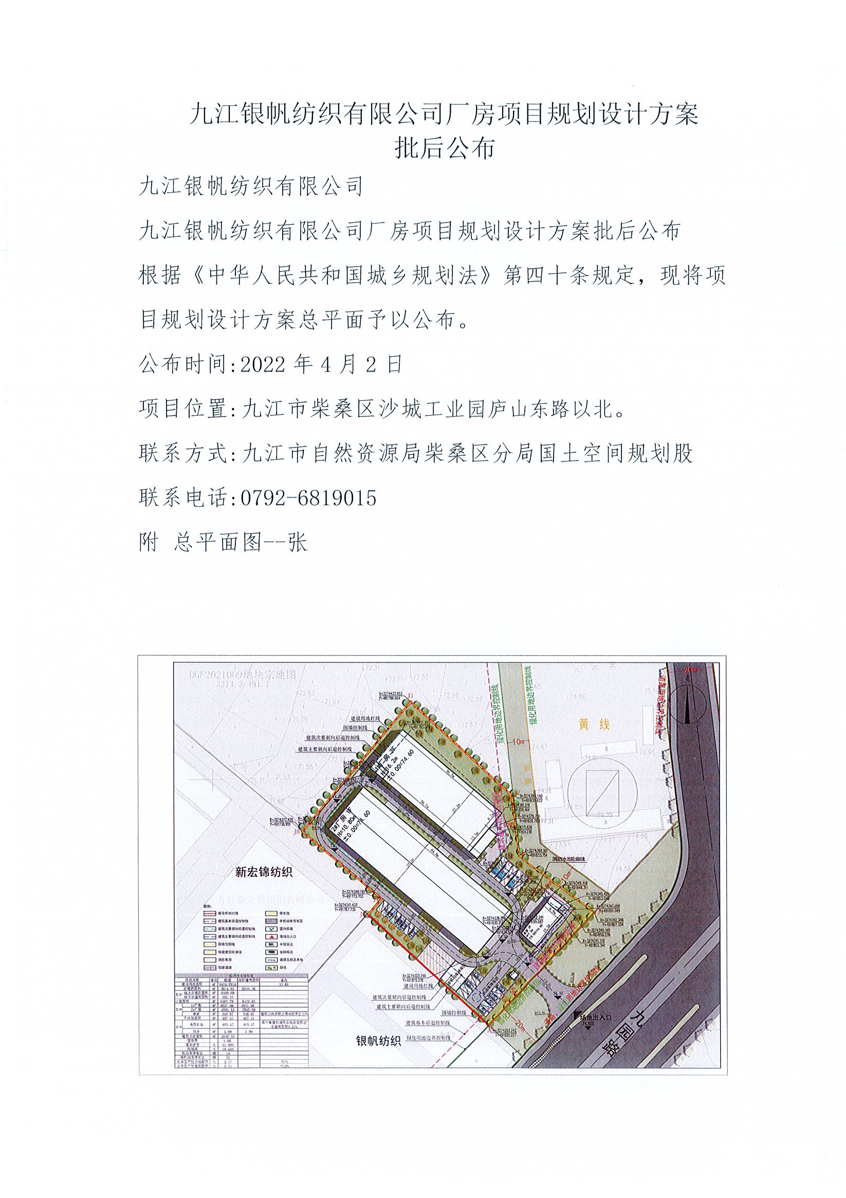 九江银帆纺织有限公司厂房项目规划设计方案批后公布