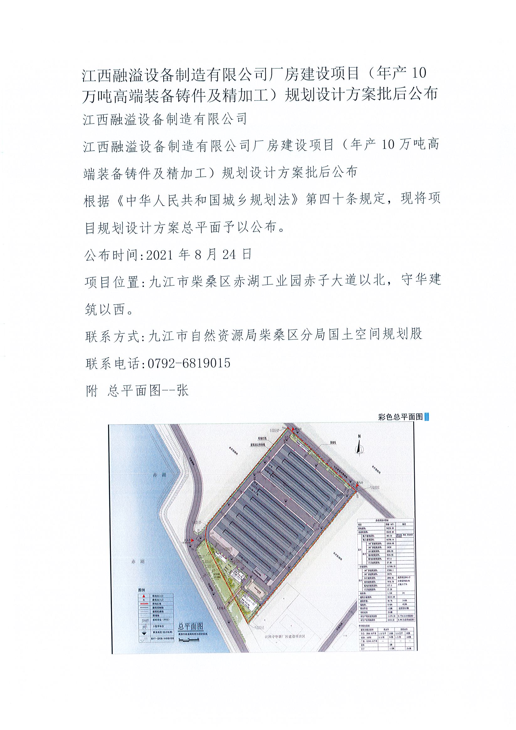 江西融溢设备制造有限公司厂房建设项目(年产10万吨高端装备铸件及精加工)规划设计方案批后公布