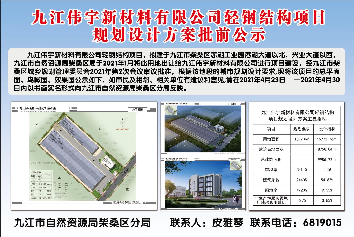 九江伟宇新材料有限公司轻钢结构项目规划设计方案批前公示