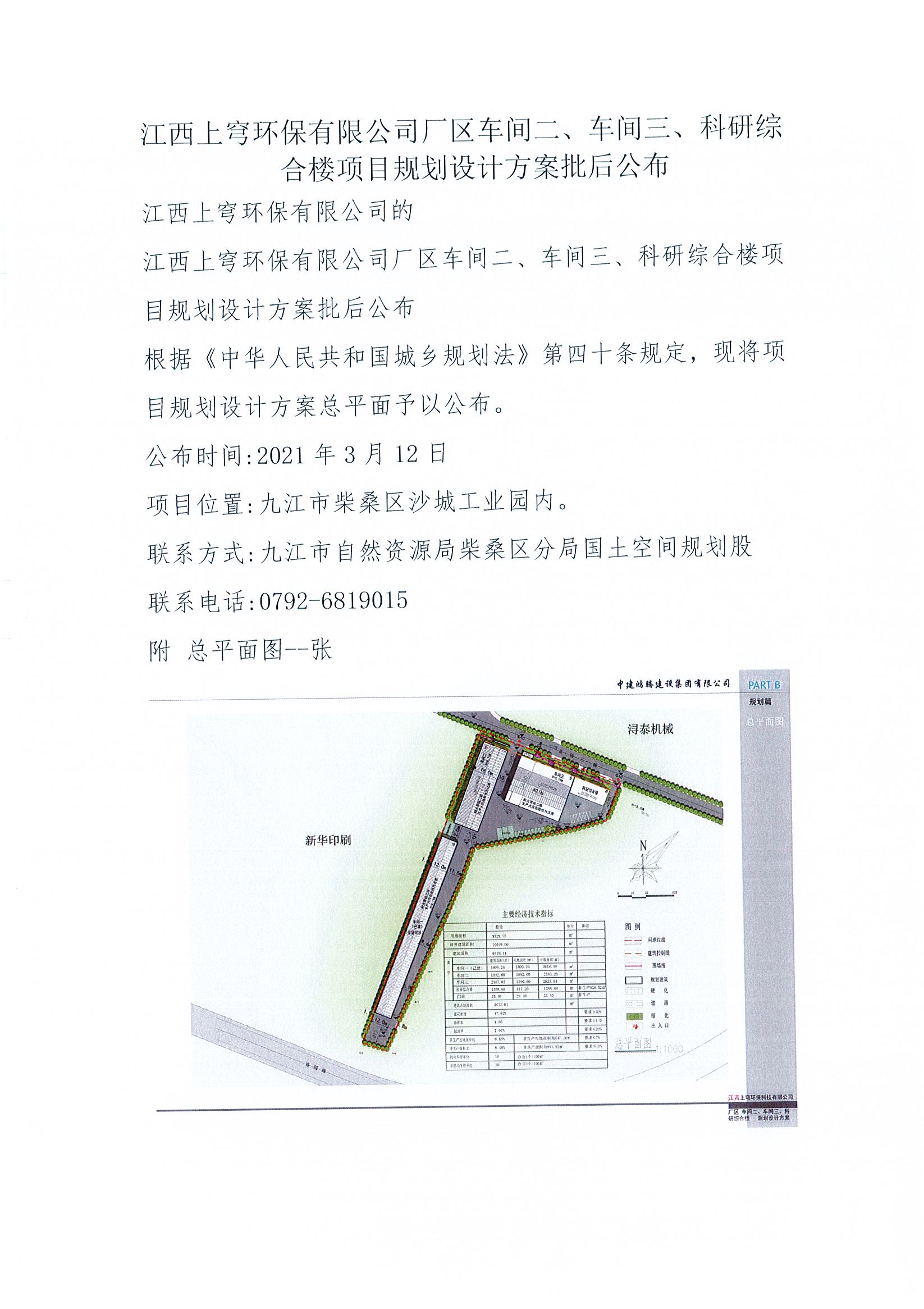 江西上穹环保有限公司厂区车间二、车间三、科研综合楼项目规划设计方案批后公布
