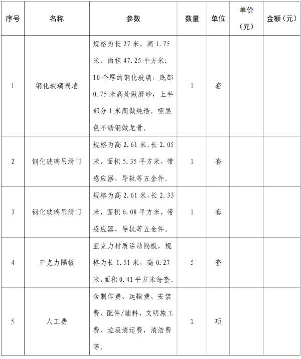 根据甘肃医学院附属医院《招标采购管理办法》的规定,我院拟对以下项目进行院内询价方式采购,欢迎符合资格条件的供应商前来报名。现将有关事项说明如下: 一、项目基本情况: 项目编号:**************** 项目名称:甘肃医学院附属医院(平凉市人民医院)检验中心钢化玻璃隔断墙维修项目 预算金额:*****.**元(本项目费用涵盖产品生产/采购、运输、装卸、人工、配件/辅料、安装、调试、保险、售后、所有成本、管理费、利润、税金、各类相关风险费用等项目实施全过程所用费用),供应商应充分考虑各种可能的成本因素,确保报价的完整性和合理性。 二、项目地点:甘肃医学院附属医院(平凉市人民医院) 三、合同签订:自合同签订之日起,**个工作日内完成维修安装并验收合格。 四、付款方式: 项目完成后,经甲方验收合格且安全使用**天后,支付合同总价款的**%,剩余**%待质保期满后,无任何质量问题一次性无息支付。 五、供应商资格要求: 满足《中华人民共和国政府采购法》第二十二条规定: *.具有独立承担民事责任的能力(须提供有效的营业执照、组织机构代码证、税务登记证、三证合一只需提供营业执照副本); *.具有履行合同所必需的设备和专业技术能力(需提供证明材料); *.提供法定代表人资格证明、法人身份证复印件(法定代表人参与投标时提供);或法人授权函、被授权人身份证复印件(非法定代表人参与投标时提供); *.提供完整的项目报价清单。 六、玻璃隔断墙工程量清单: 七、服务要求: *.维修所供产品/材料必须符合国家相关产品行业标准,同时满足医院询价公告中明确的规格、参数要求,提供产品合格证、出厂证明、有效的检测报告等文件。 *.结合医院现场条件(如尺寸、位置、区域要求等)制定科学、合理的实施方案,避免影响医院诊疗流程和空间使用,减少噪音干扰。 *.实施过程需遵守医院消防、环保及安全要求和规范,确保维修安全,维修后钢化玻璃隔断墙使用规范,设施稳固、感应灵敏、导轨滑动无障碍、使用安全,满足日常工作需求,长期使用稳固、无晃动。 *.施工过程中保护现有设施,不得损坏地面、墙体、消防设施、监控设备等,若因施工造成损坏,供应商需无条件维修或赔偿。施工完成后,及时清理现场垃圾,做到工完场清,恢复场地整洁。 *.项目实施过程中,应保障工作人员及第三方人员人身及财产安全,严格执行安全操作规范,如发生安全事故,均由供应商负责,给采购人造成的损失,由供应商负责赔偿。 八、质保期: 质保期*年,自项目验收合格之日起计算。 *.质保期内,供应商须提供****小时售后服务,凡因产品或安装问题导致的故障需无条件退换或维修,且退换或维修后质保期重新计算。 *.接到医院维修通知后,*小时内予以响应,**小时内到达现场维修。紧急故障*小时内到场。 九、验收标准及要求: *.项目完成后,采购人将组织相关人员进行验收。验收标准以询价公告中的技术参数要求、合同约定及国家相关标准为依据;供应商须提供产品的合格证明文件、检测报告、使用说明书等相关资料。? *.验收过程中,如发现存在质量问题或施工不符合合同要求,供应商应负责免费整改,直至验收合格并签署验收确认单。 十、报名时间: 从即日起至*月**日**:**,按公告要求准备相应资料并装订成册,邮寄至甘肃省平凉市崆峒区崆峒东路***号甘肃医学院附属医院(平凉市人民医院)行政办公楼***室。 十一、响应文件开启: 时间:****年*月**日**:** 地点:甘肃医学院附属医院(平凉市人民医院)行政办公楼*楼评标室 十二、评审方法: 询价成交原则:询价小组按询价公告和投标人提供的响应文件评审,在资质条件、采购需求均满足的同等条件下,以报价最低中标。 十三、联系方式: 联系人:王老师 联系电话:************ 后勤基建科 ****年*月**日