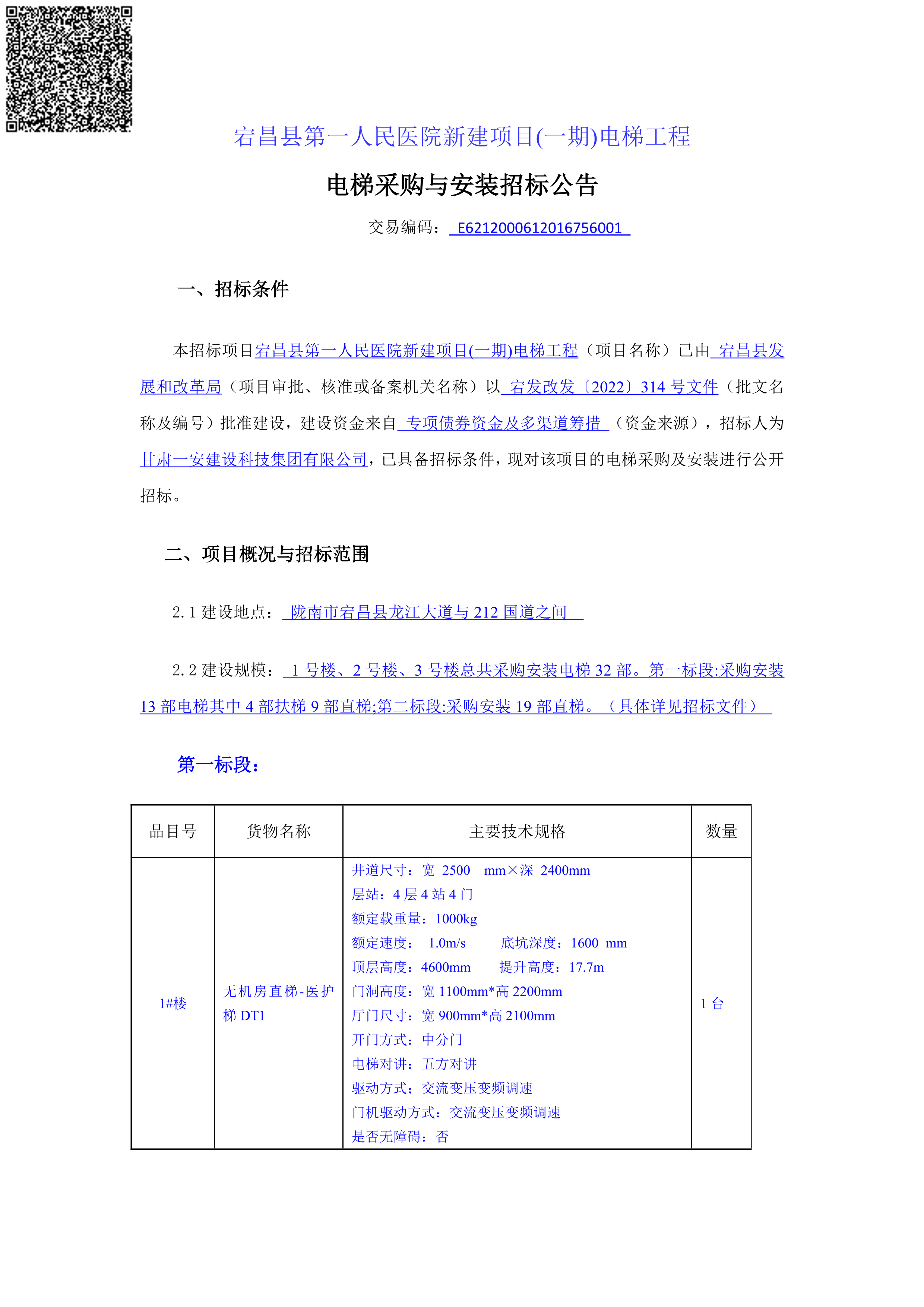 宕昌县第一人民医院新建项目(一期)电梯工程电梯采购与安装招标公告[招标/资审公告]