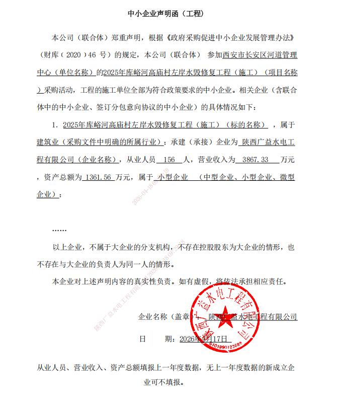 西安市长安区河道管理中心2025年库峪河高庙村左岸水毁修复工程(施工)中标(成交)结果公告