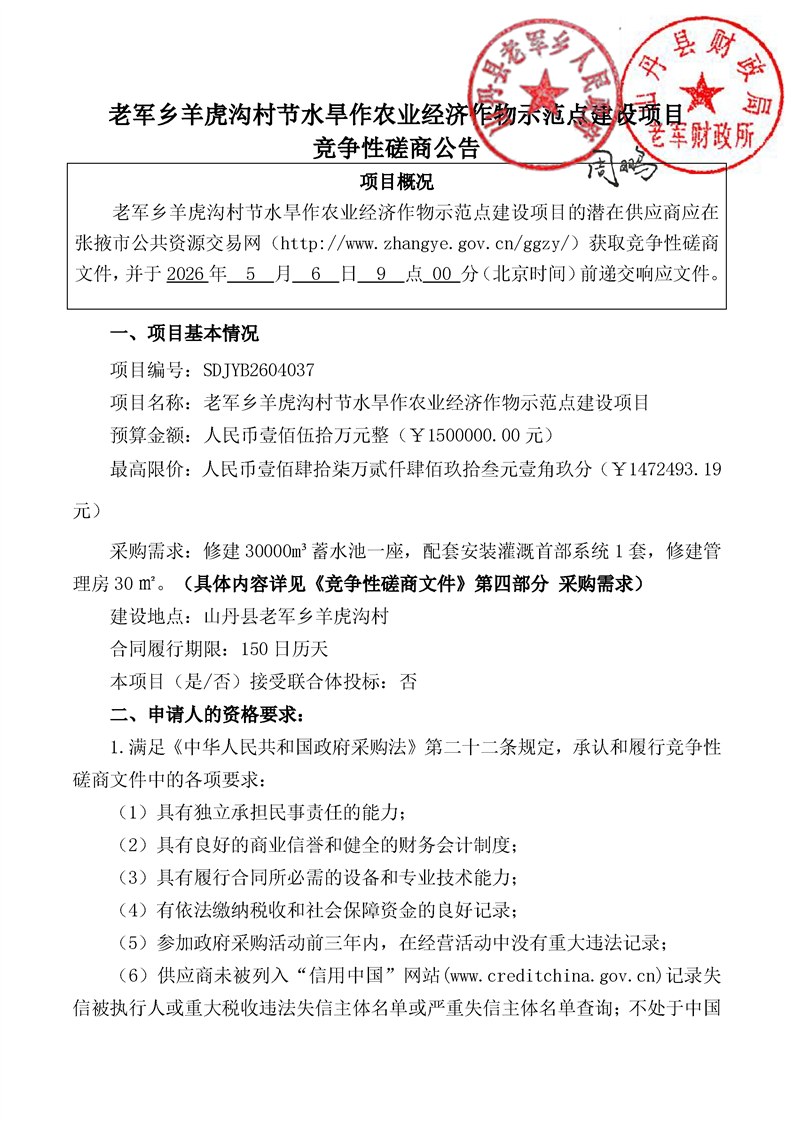 老军乡虎沟村节水旱作农业经济作物示范点建设项目竞争性磋商公告[采购/资审公告]