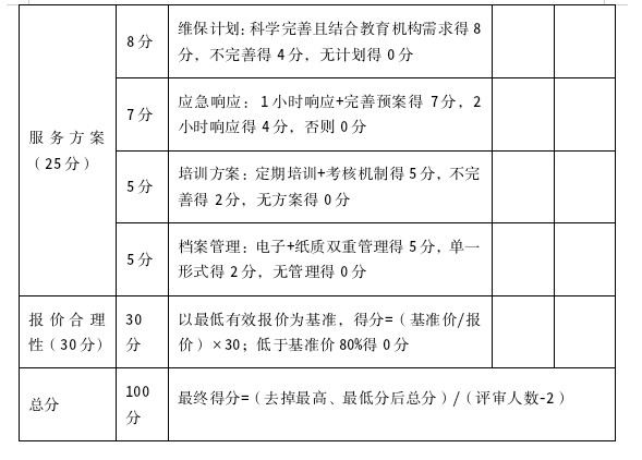 罗甸县教育局组建不少于*人的评审小组,按照《询价比选综合评分表》的评分标准且遵循“公开、公平、公正、择优”的原则开展评审工作,最终选取得分最高的作为中选服务机构。评选具体时间及地点在现场递交响应文件时另行通知。