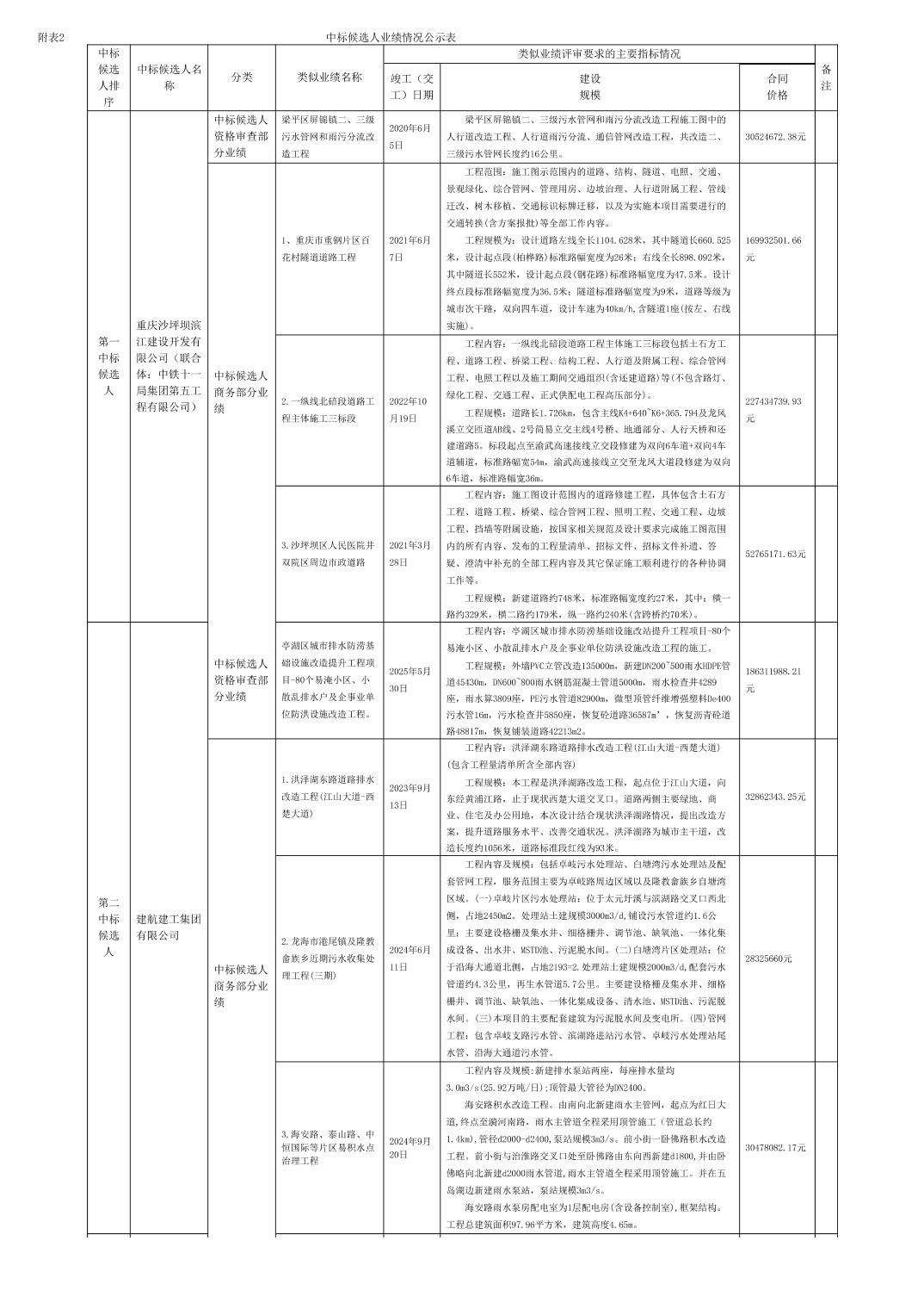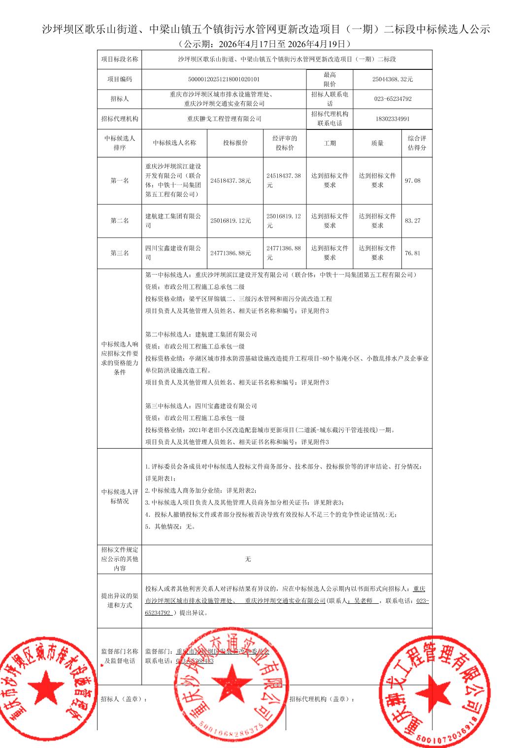 沙坪坝区歌乐山街道、中梁山镇五个镇街污水管网更新改造项目(一期)二标段中标候选人公示